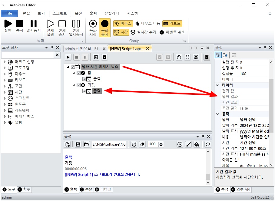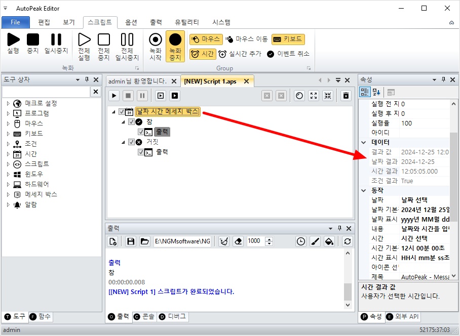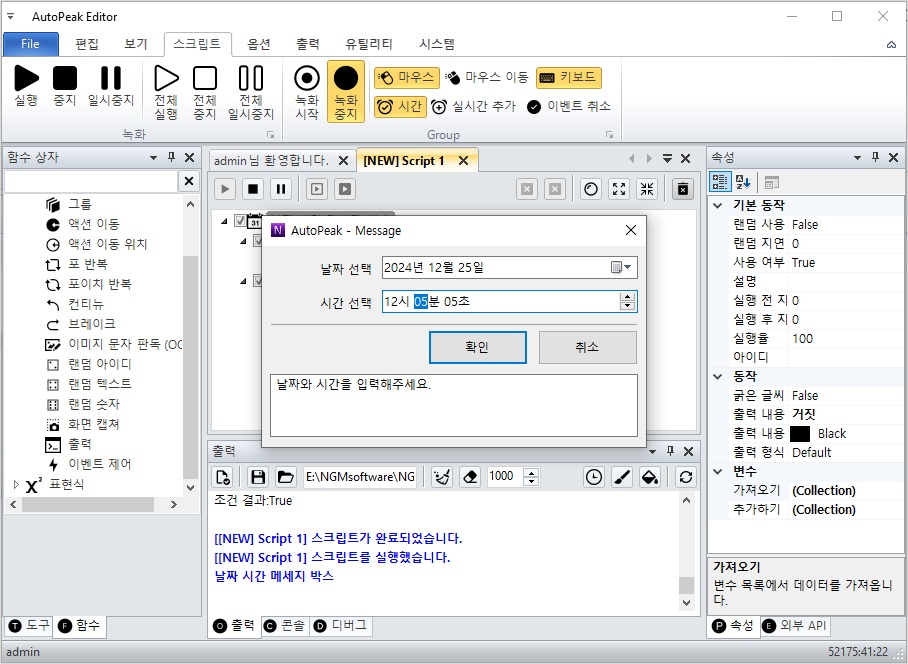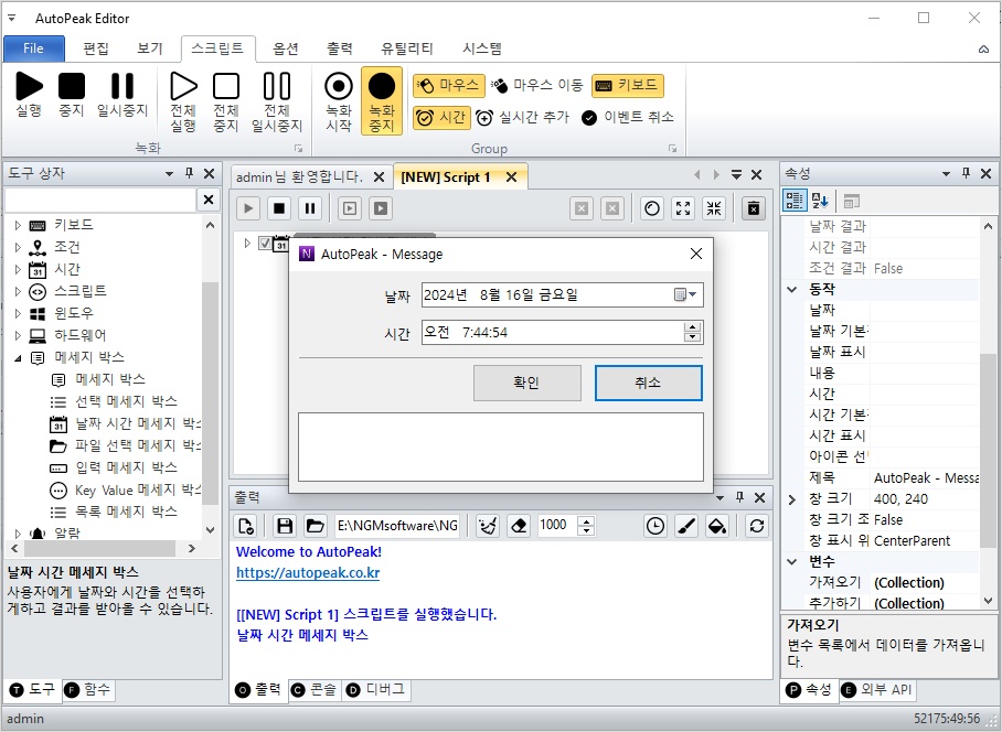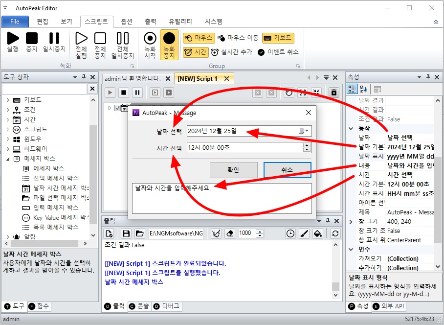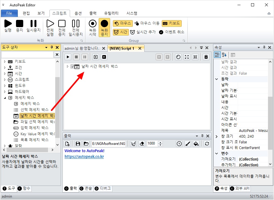 그리고, 날짜 시간 메세지 박스 액션을 더블 클릭하여 새 스크립트에 추가 해줍니다.
