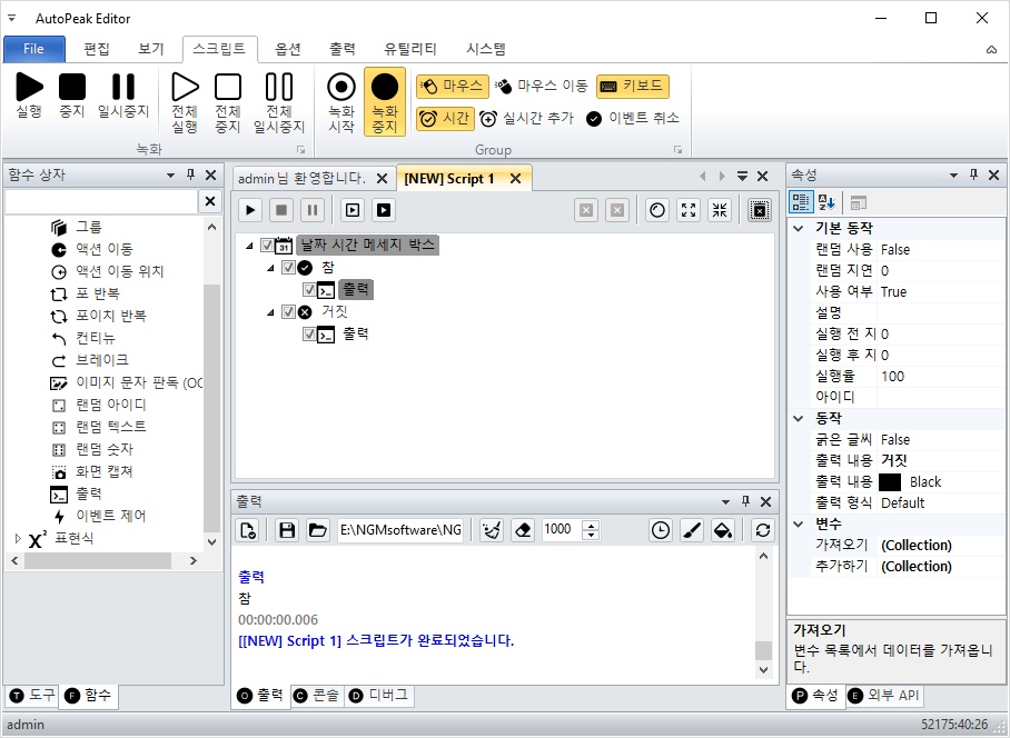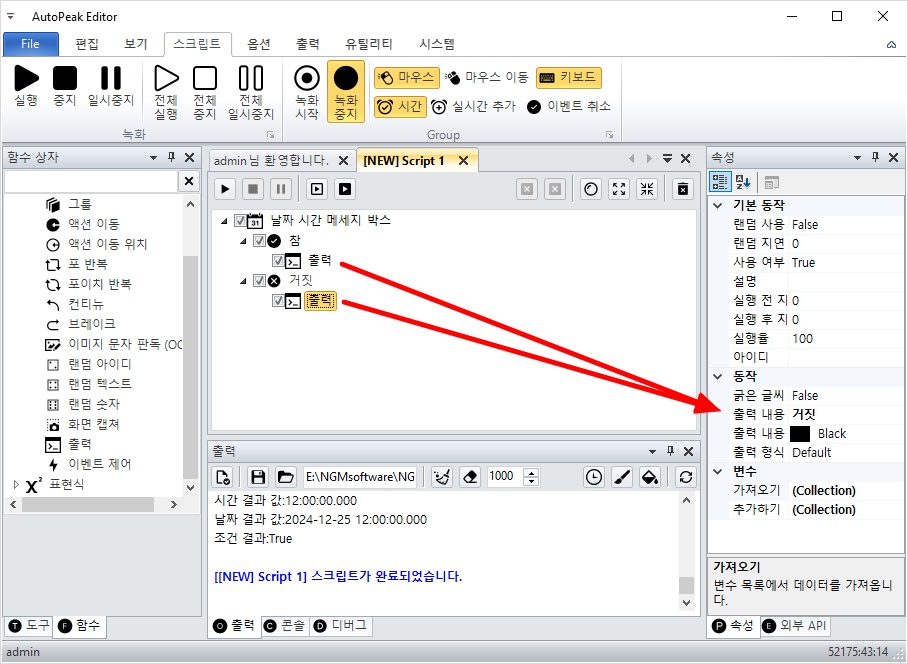 그리고, 출력 액션의 우측 속성창에서 출력 내용에 참과 거짓을 입력합니다.