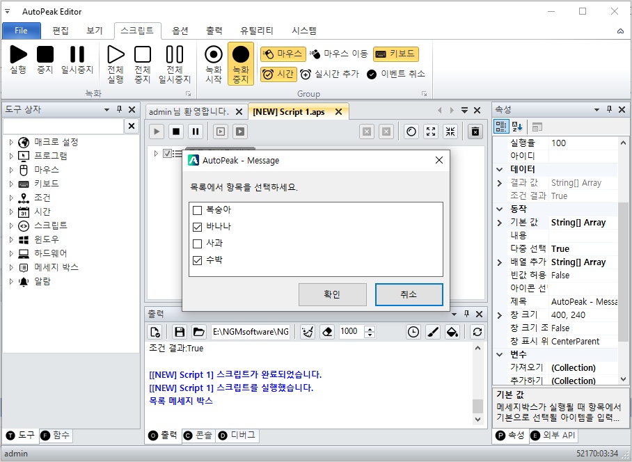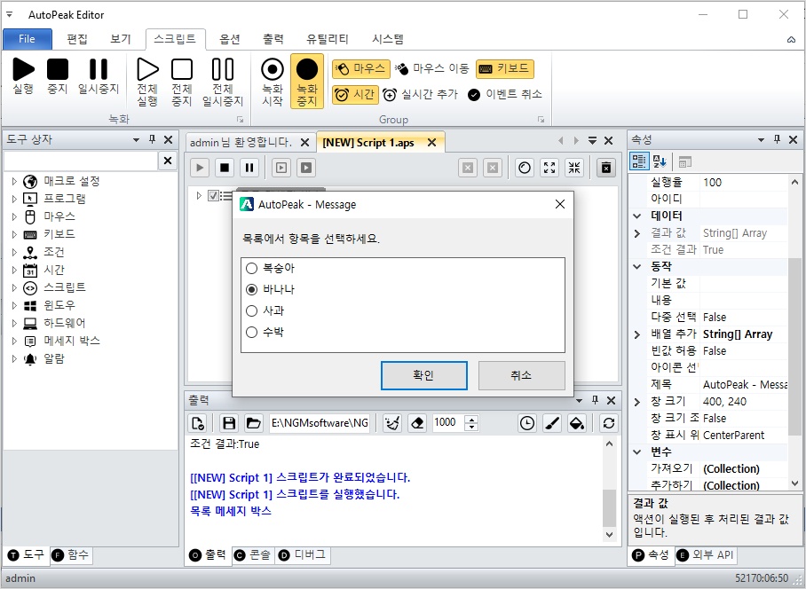 오토픽 에디터를 실행하고, 좌측 하단의 도구 상자에서 메세지 박스 카테고리를 확장하세요.