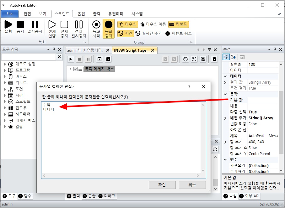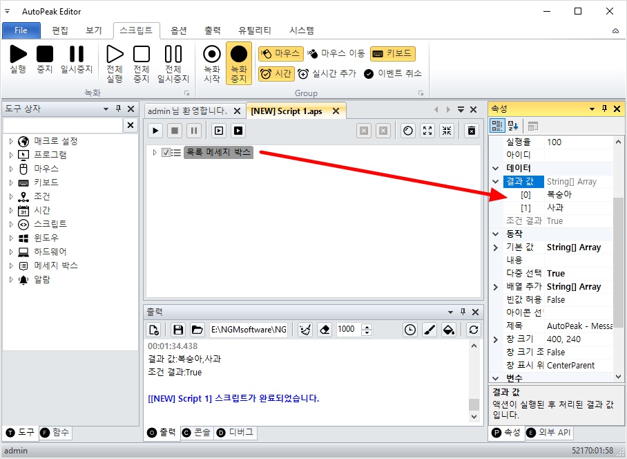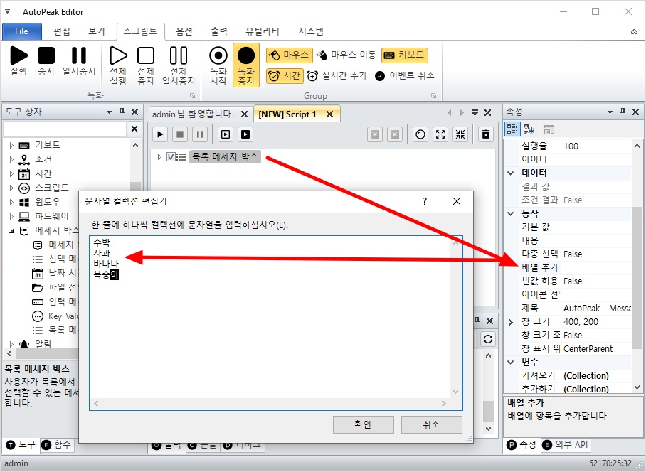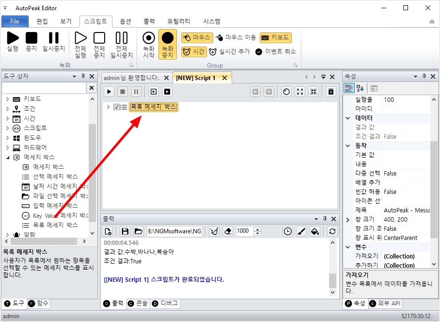 그리고, 목록 메세지 박스 액션을 더블 클릭하세요.