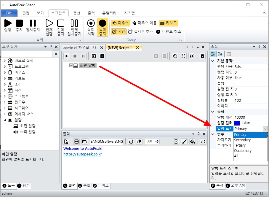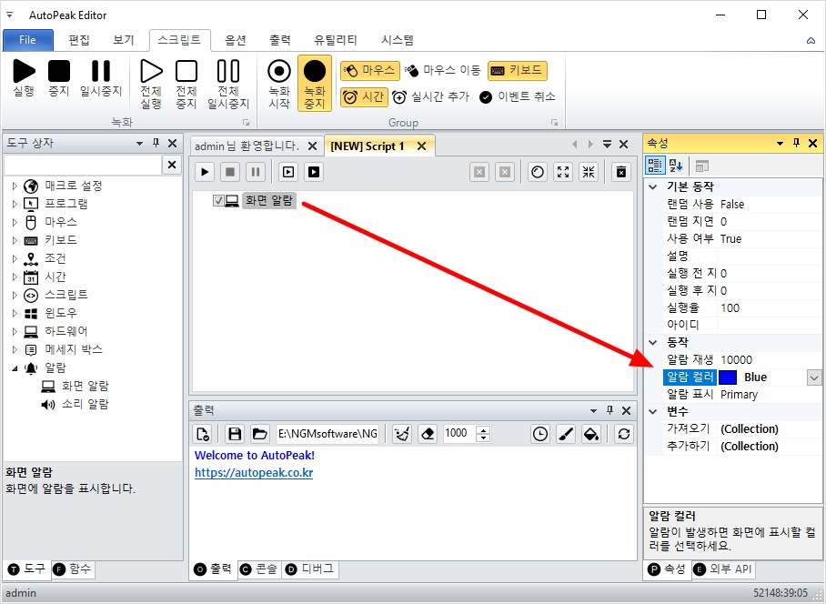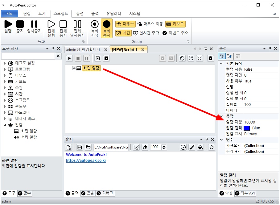 오토픽 에디터를 실행하고, 좌측 하단의 도구 상자에서 가장 마지막에 있는 알람 카테고리에서 화면 알람을 추가할께요.