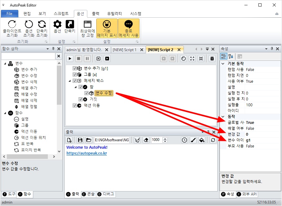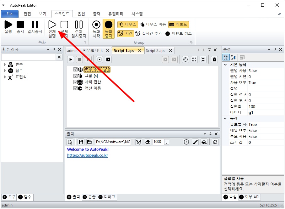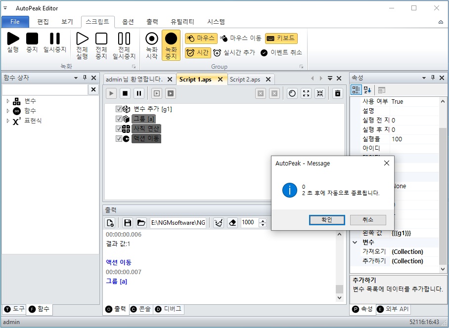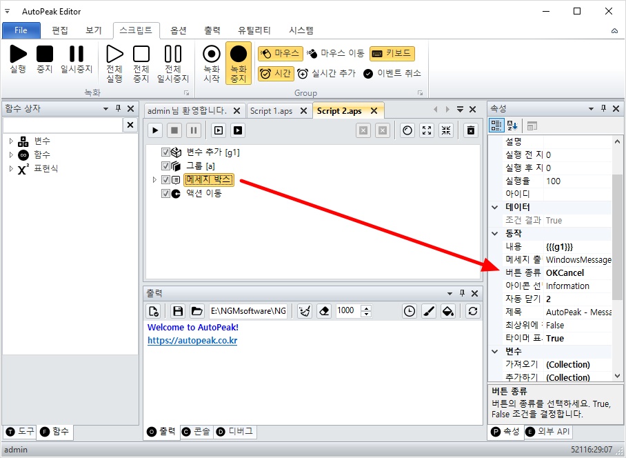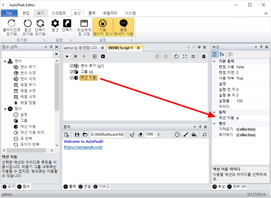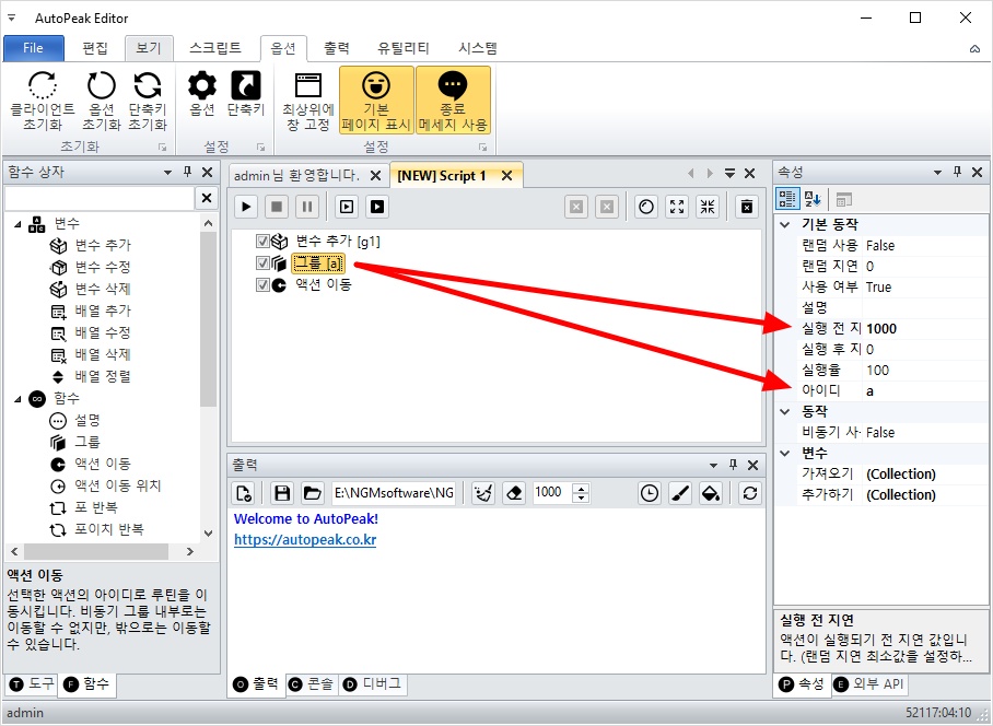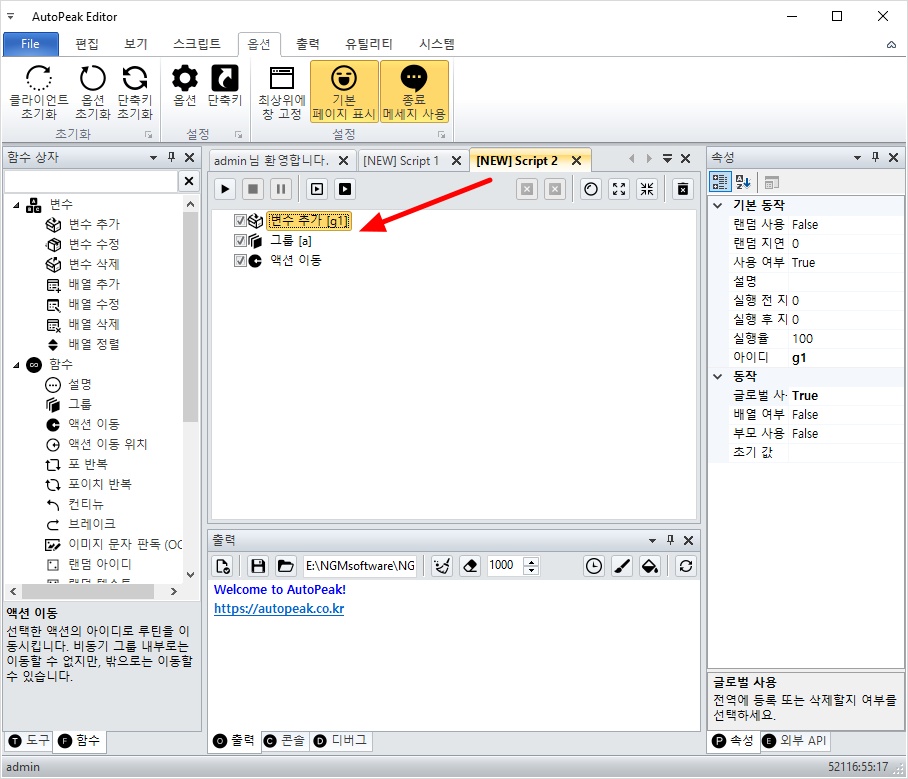 새로운 스크립트가 추가됩니다. 그리고, 스크립트 1처럼 변수 추가와 그룹 그리고, 액션 이동을 추가하세요.
