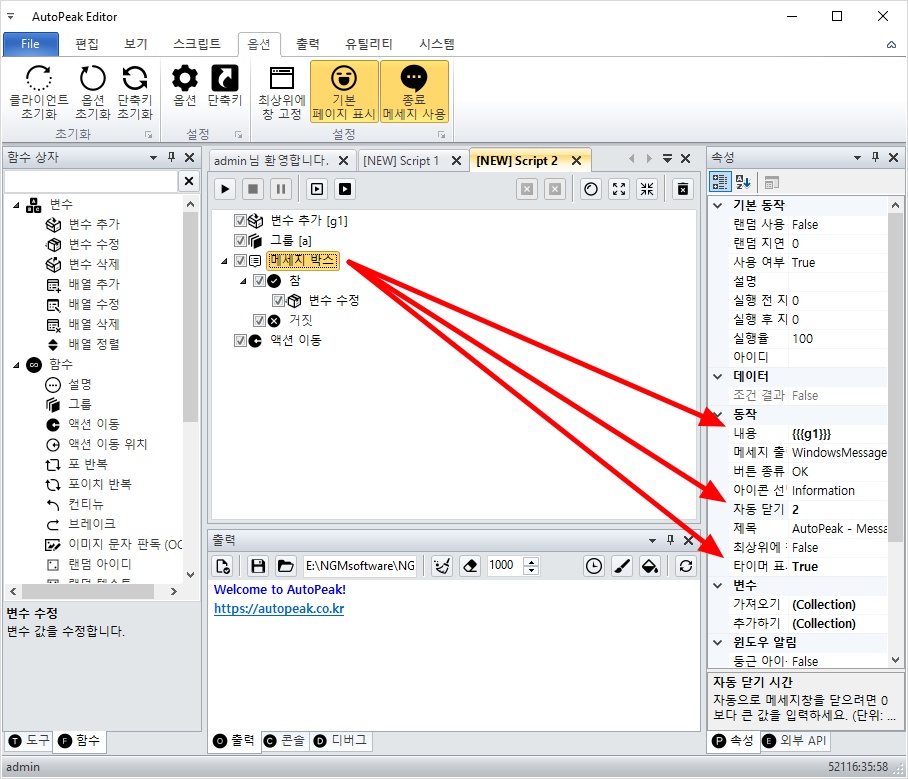 메세지 박스의 내용으로 변수 값을 가져오고, 2초 후 자동으로 닫히도록 설정했습니다.