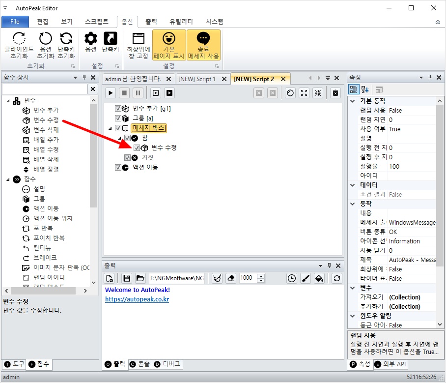 메세지 박스의 참 루틴 안에 변수 수정을 하나 추가 해줍니다.
