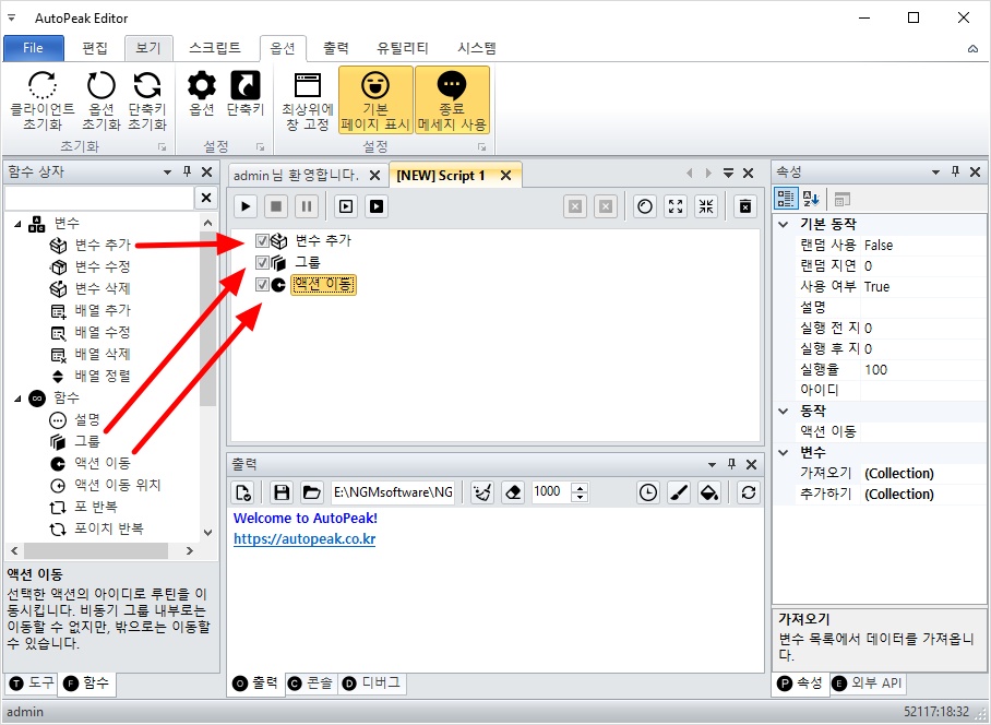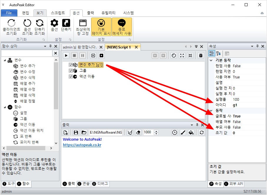 우선, 카운트를 증가시키는 스크립트를 만들어볼께요. 오토픽 에디터를 실행하고 변수 추가 액션을 추가하고, 그룹과 액션 이동도 추가하세요.