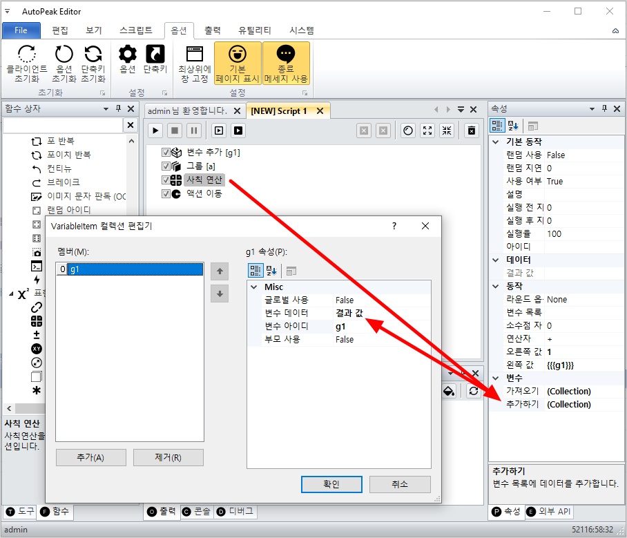 속성창 마지막의 변수 카테고리에서 추가하기를 클릭하세요. 그리고, 결과 값을 변수에 다시 저장해줍니다.