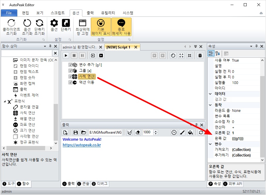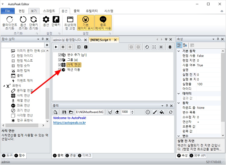 표현식 카테고리에 있는 사칙 연산 액션을 그룹과 액션 이동 사이에 추가해줍니다.