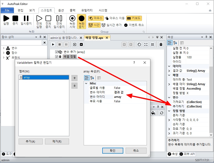 배열 정렬을 하나 더 추가하고, 변수에서 배열 데이터를 가져옵니다. 그리고, 변수에 결과 값을 추가하세요.