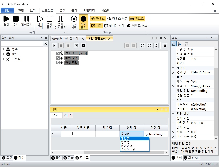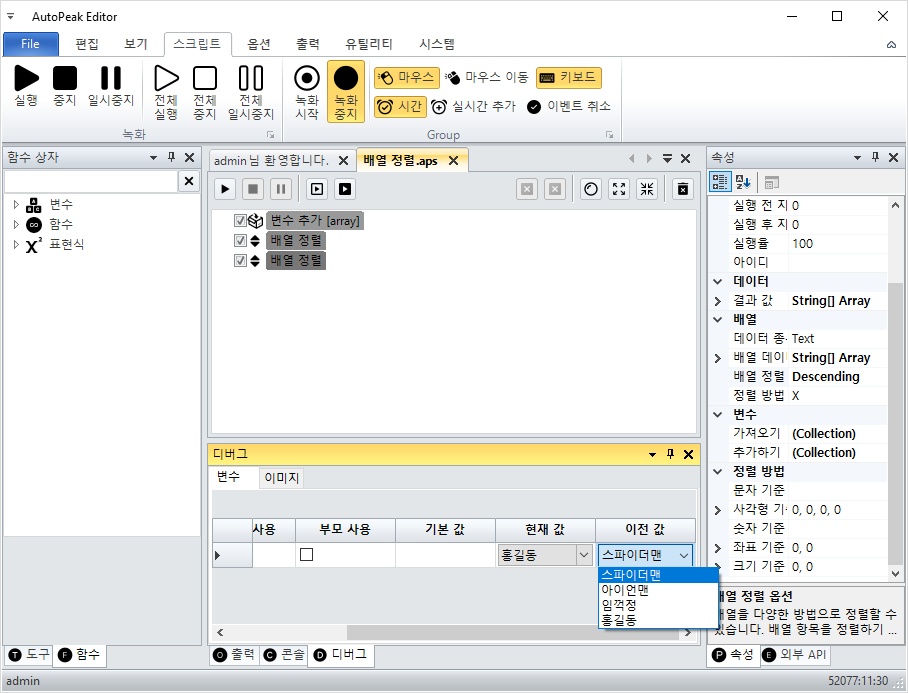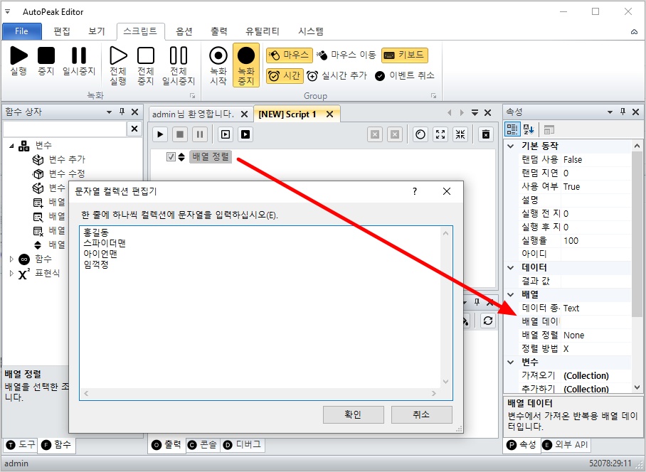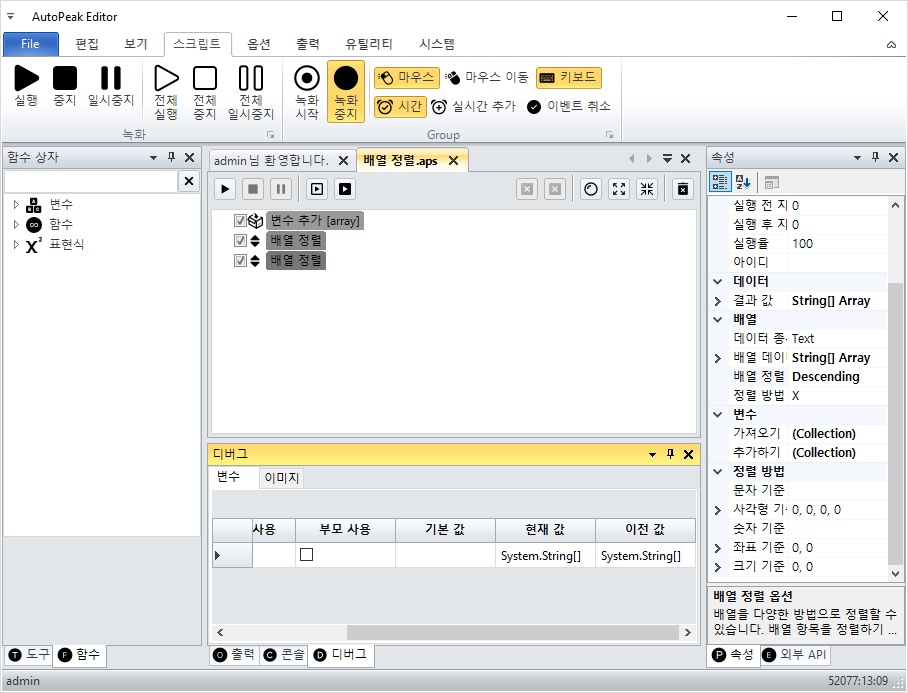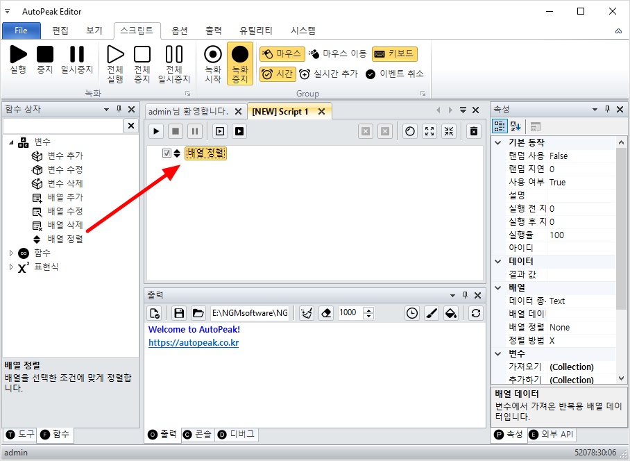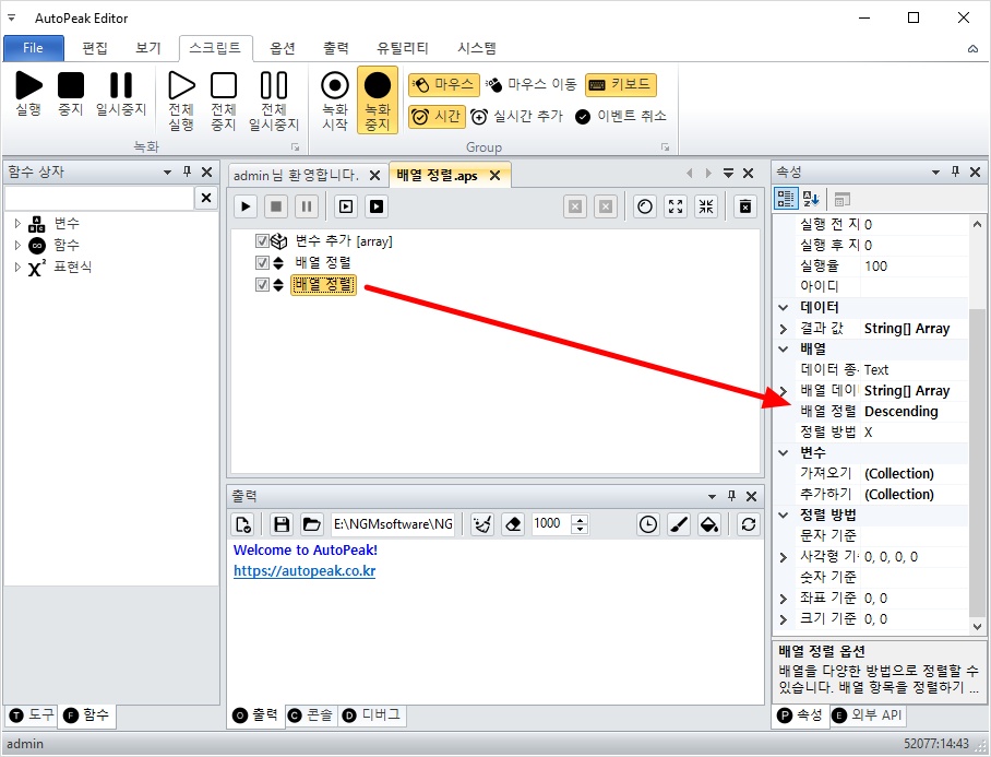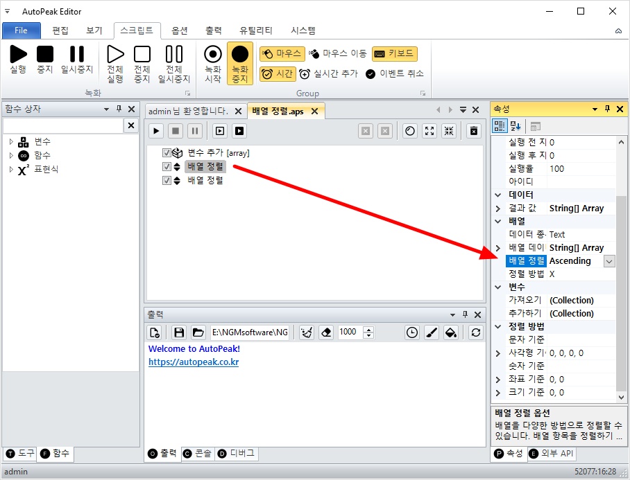 배열 정렬을 학습하기 위해 오토픽 에디터를 실행하고, 왼쪽 하단의 함수 상자를 선택하고 배열 정렬 액션을 추가하세요.