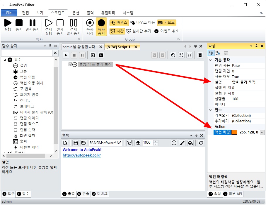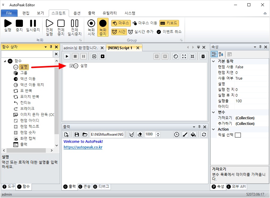 함수 카테고리에 설명 액션을 더블 클릭해서 스크립트에 추가하세요.