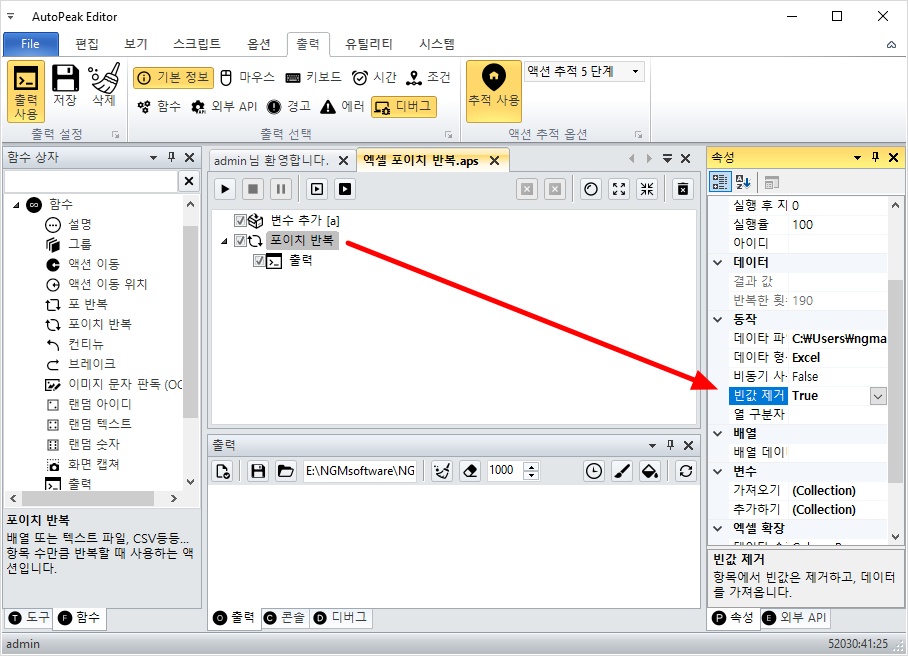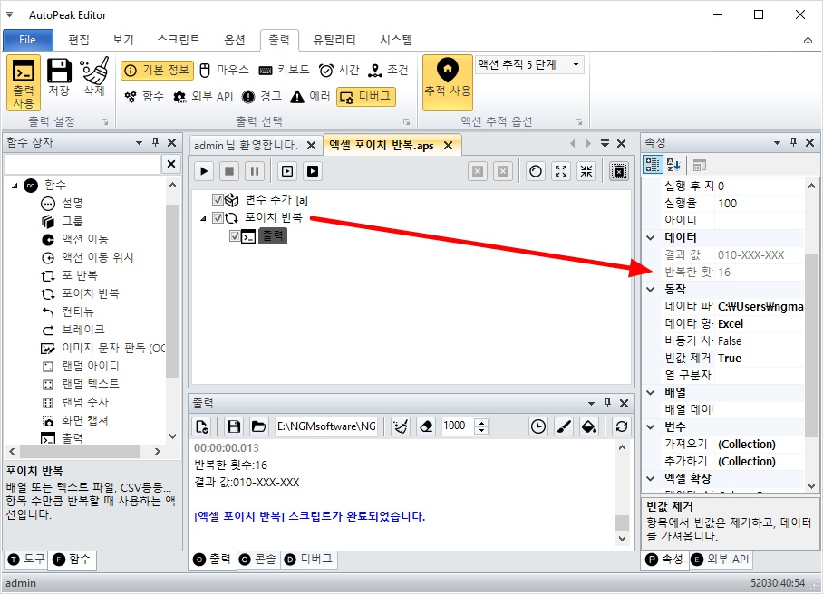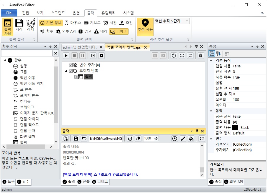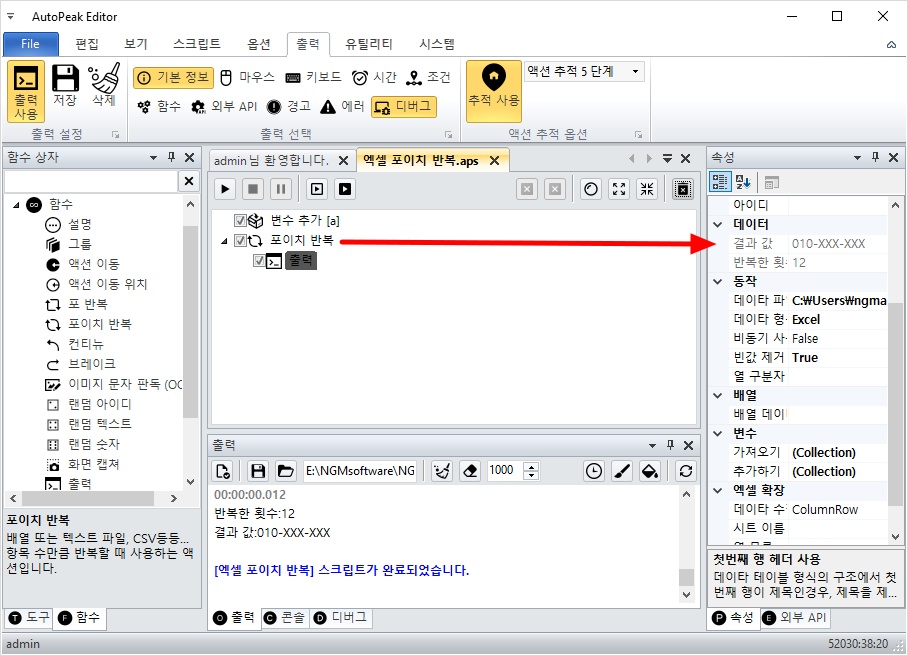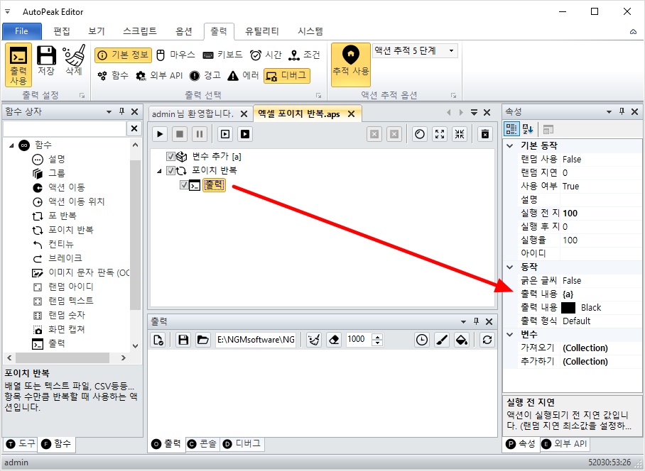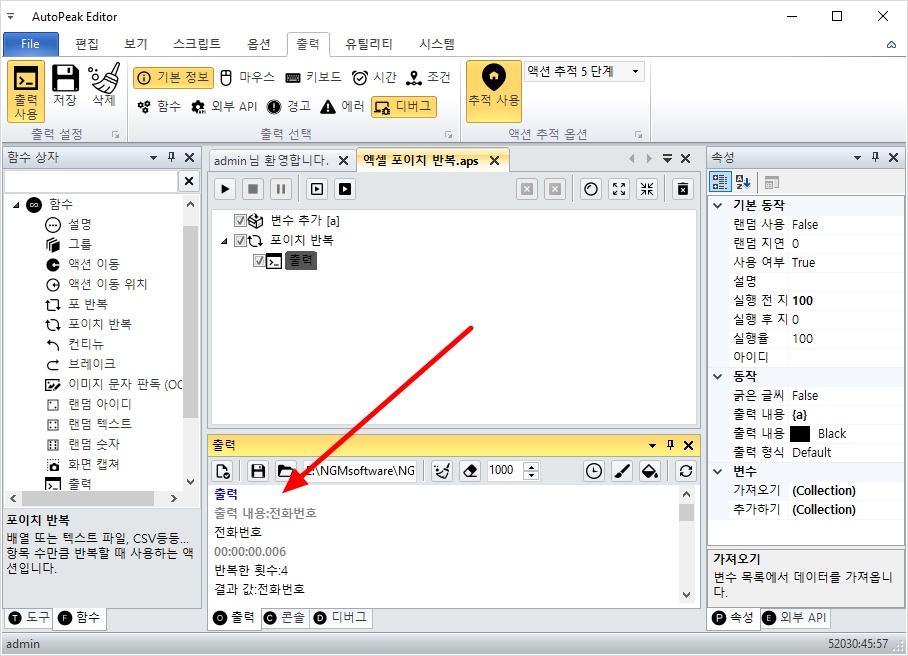 그리고, 포이치 반복 액션안에 셀 값을 하단 출력창에 표시할 출력 액션도 추가해주세요.