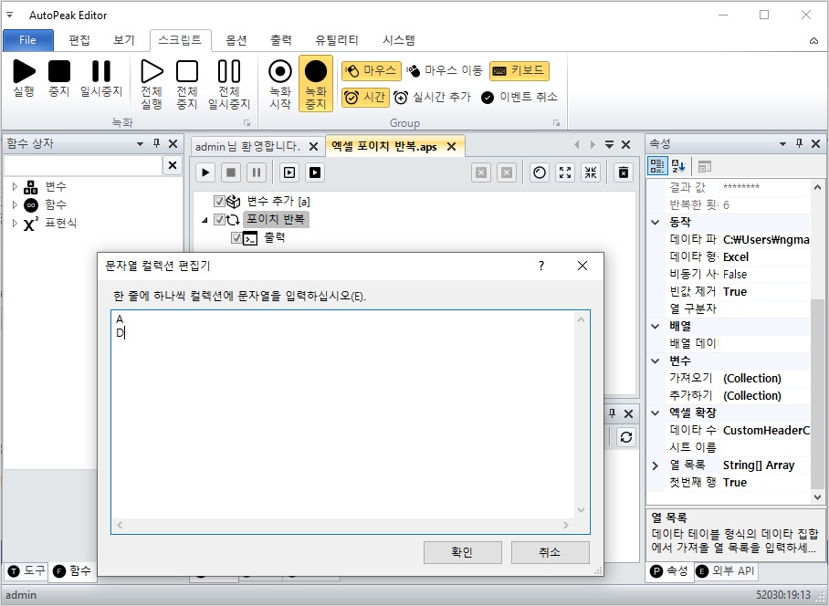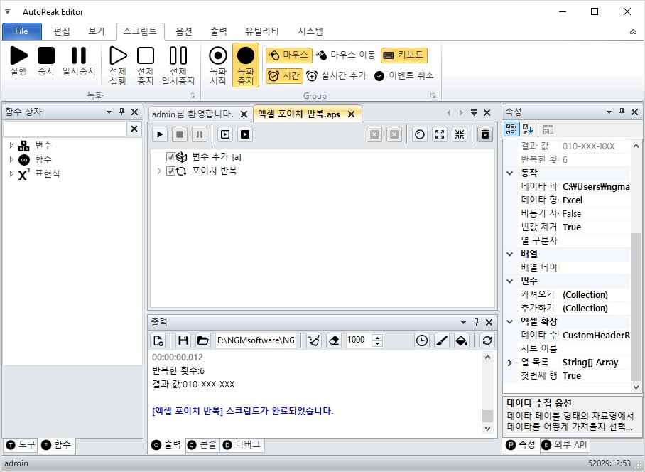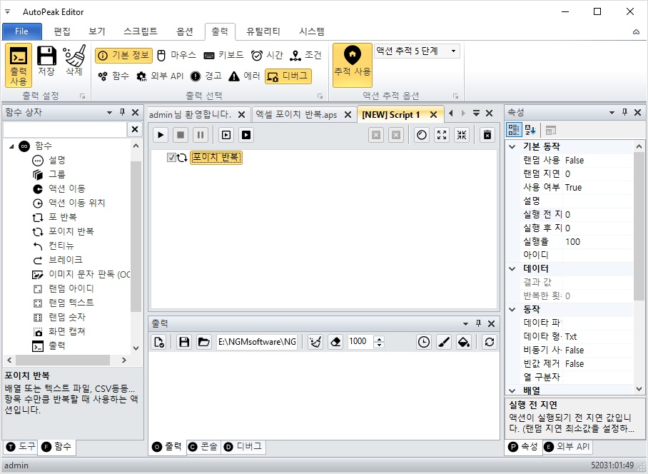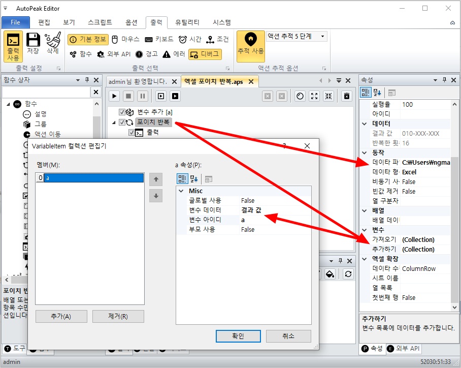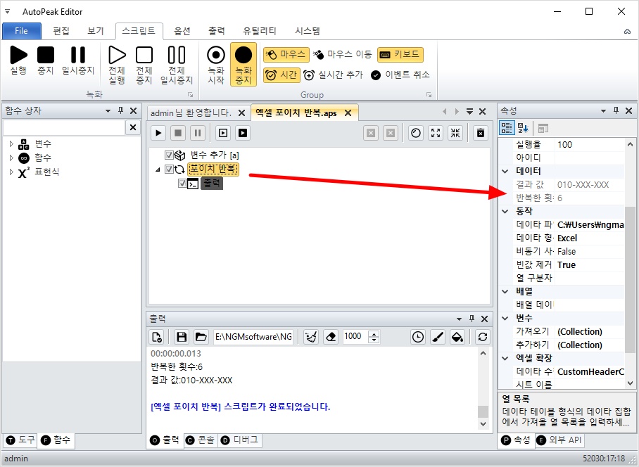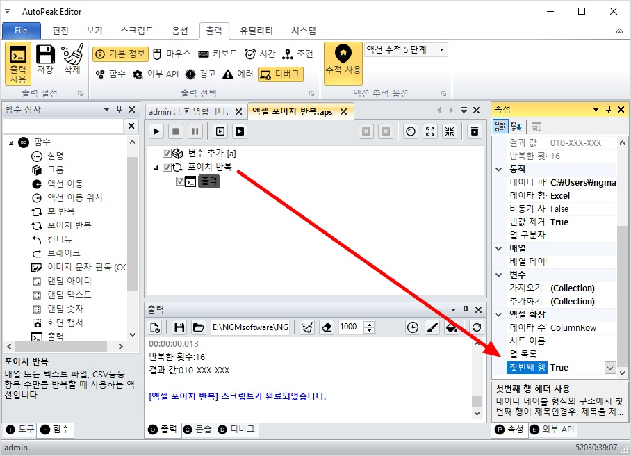 그리고, 포이치 반복 액션안에 셀 값을 하단 출력창에 표시할 출력 액션도 추가해주세요.
