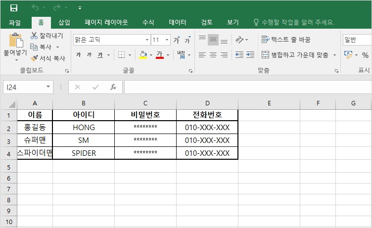 참고로, 추가 테스트를 위해서 미리 열과 행에 빈 값을 어느정도 추가 해두었습니다.