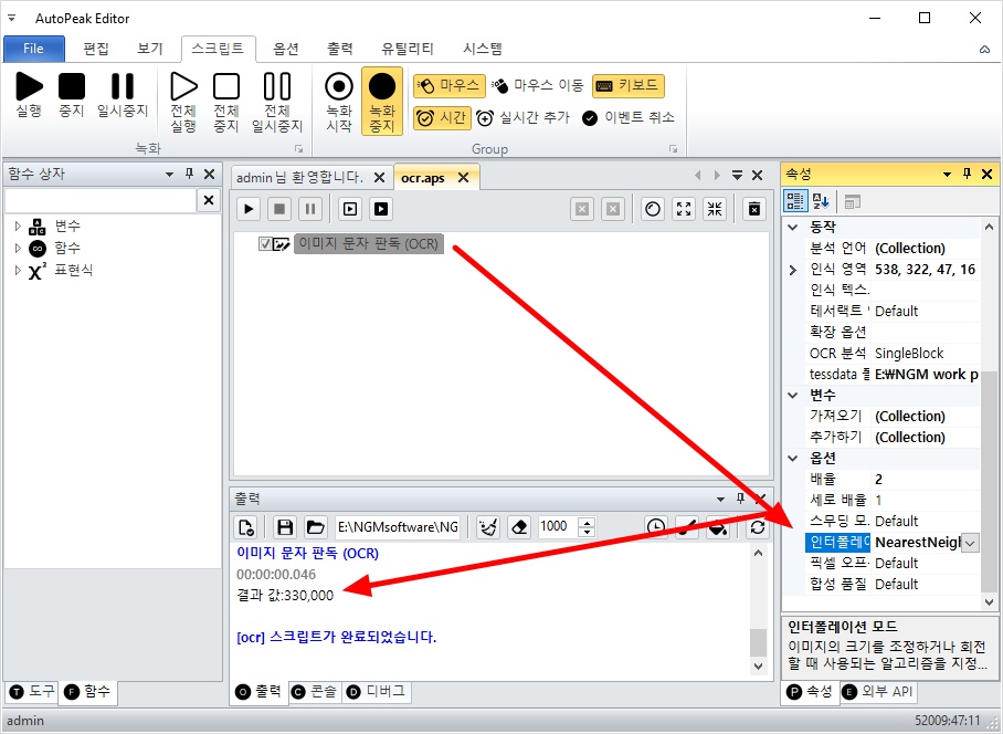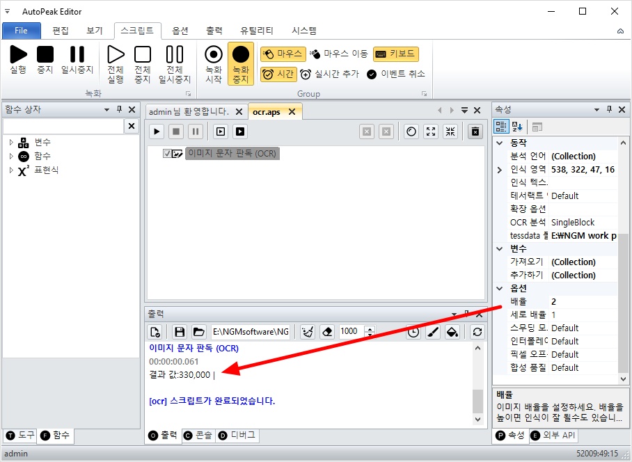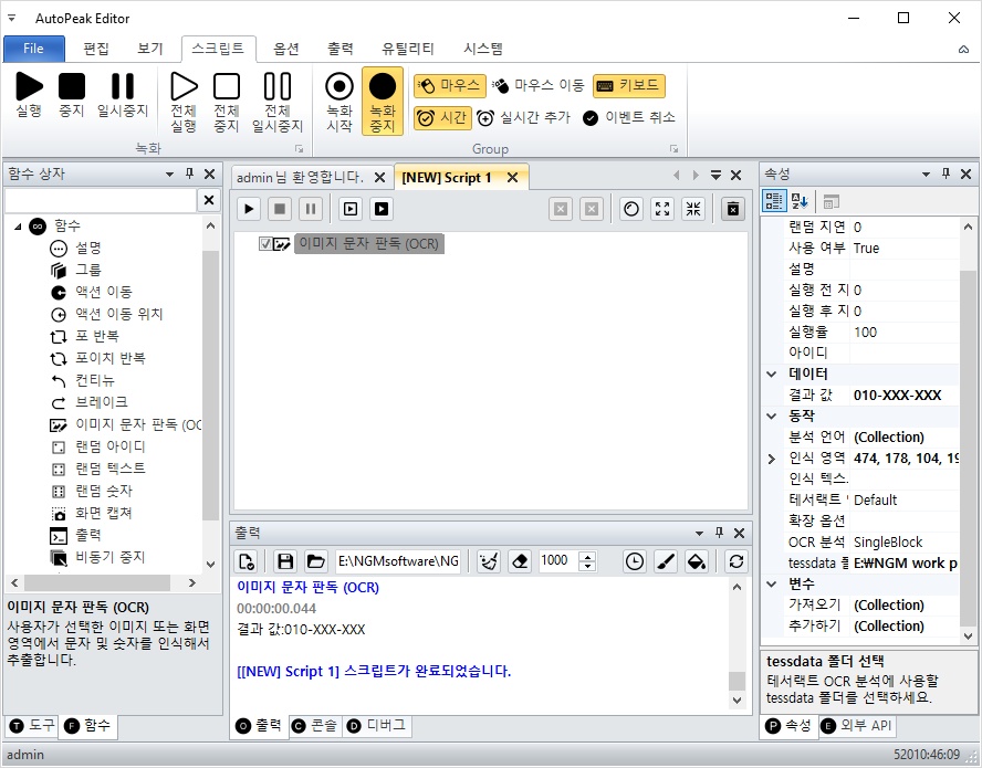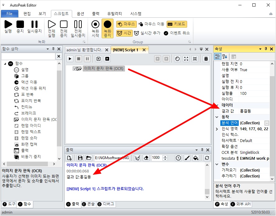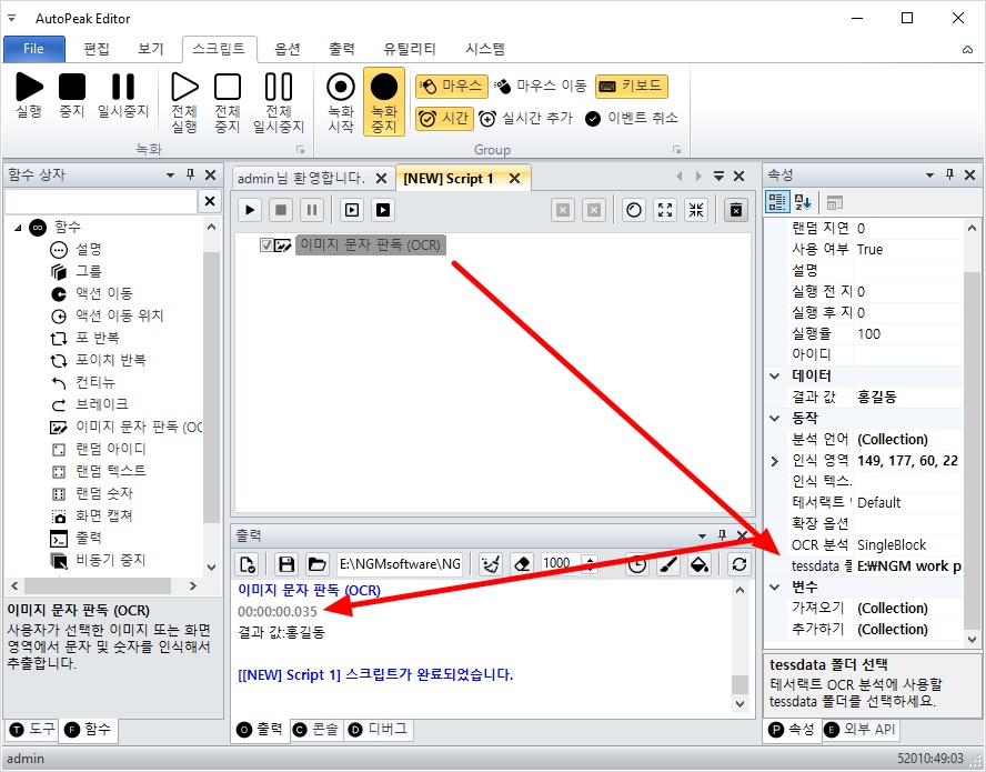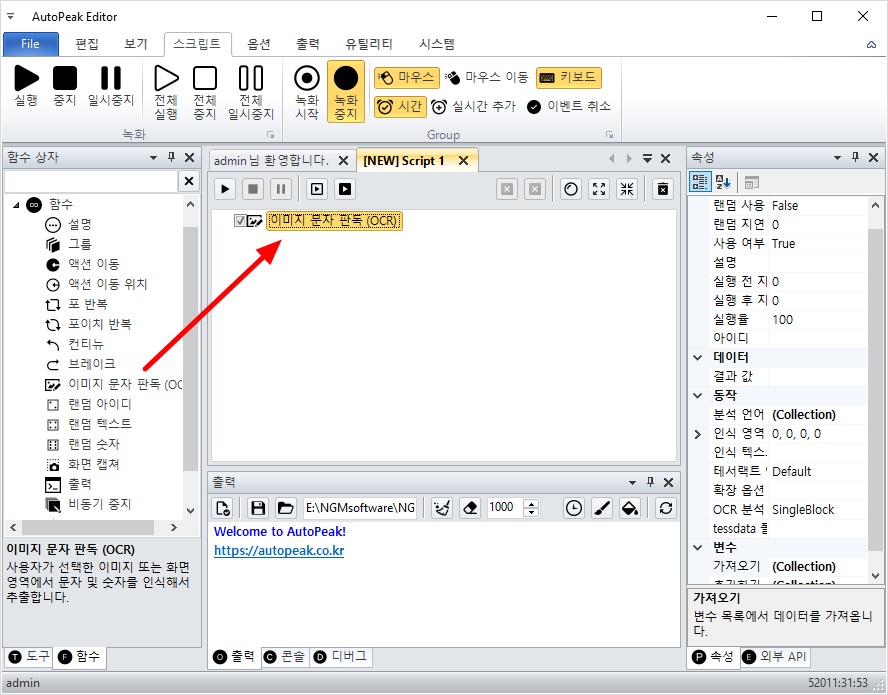 그리고, 이미지 문자 판독 액션을 더블 클릭해서 스크립트에 추가해줍니다.