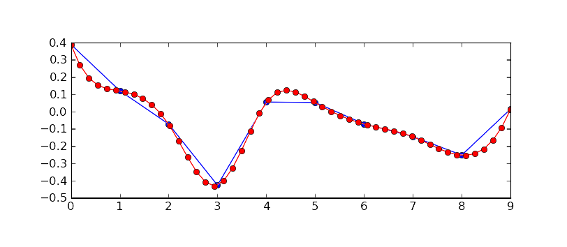 아래 그림을 보면 좀 더 쉽게 이해할 수 있을텐데요. 파란색 선과 같이 데이터가 부족할 때 보간법을 사용해서 촘촘하게 데이터를 채워줍니다.
