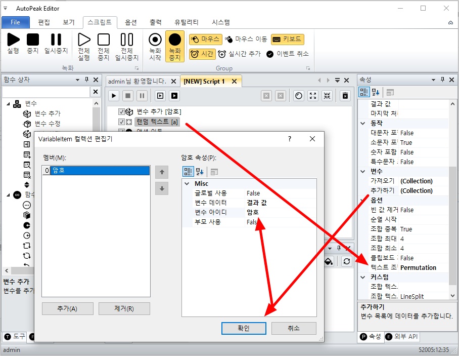 입력할 암호를 랜덤 텍스트로부터 받아야 합니다. 변수를 추가하고, 아이디는 암호로 설정하세요.