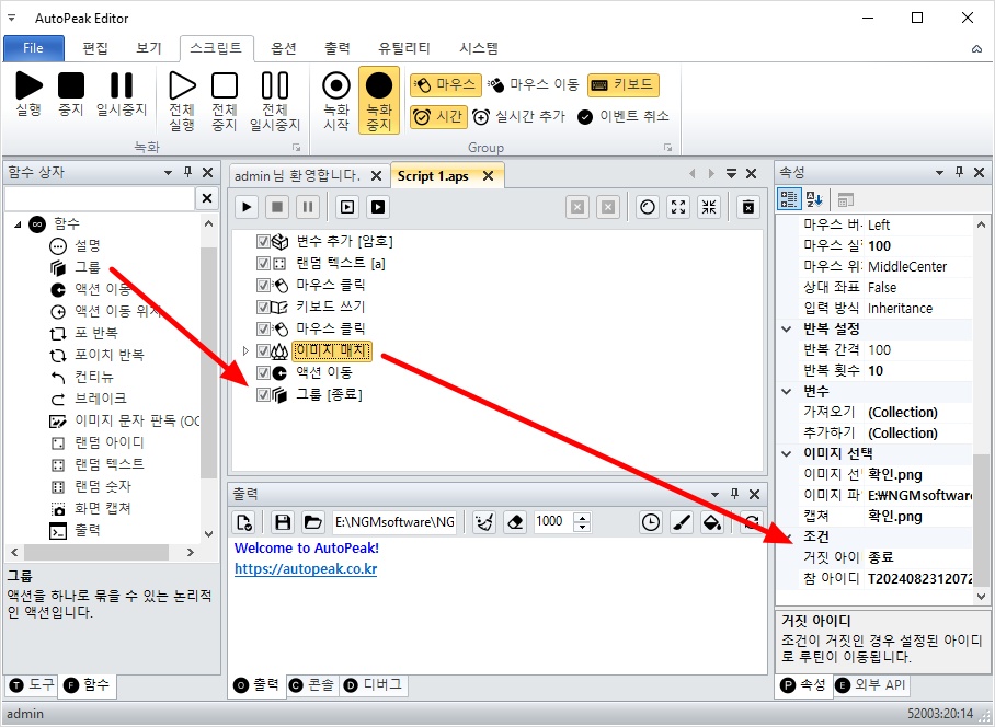 이미지 매치가 이 창을 캡쳐해서 비교해주는데요. 만약, 암호가 풀려서 경고창이 뜨지 않으면 마지막 그룹 종료로 이동하도록 설정해야 합니다.