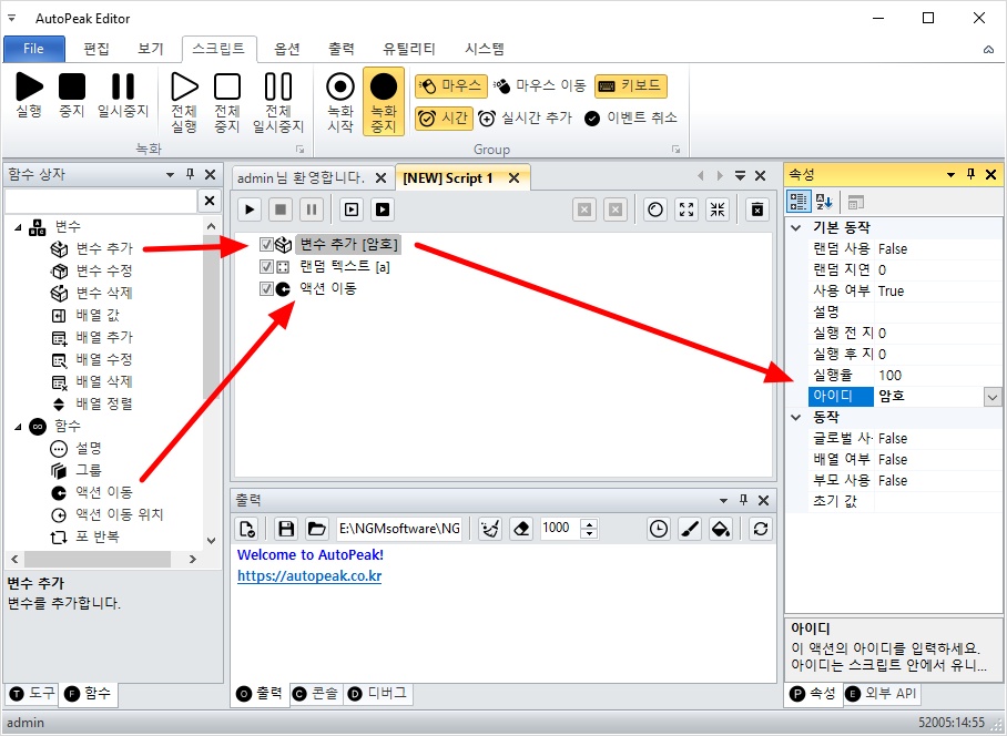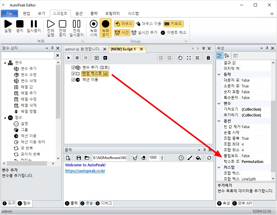 테스트를 위해 오토픽 에디터를 실행하고, 좌측 하단의 함수 상자에서 함수 카테고리를 확장하고 랜덤 텍스트를 더블 클릭해서 스크립트에 추가하세요.