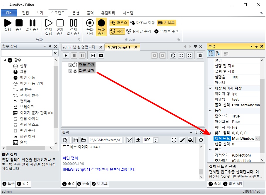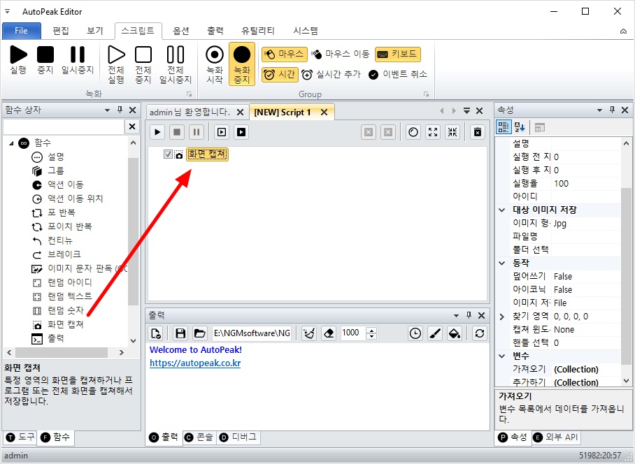 함수 상자의 함수 카테고리를 확장하면 화면 캡쳐 액션이 있습니다. 더블클릭해서 스크립트에 추가하세요.