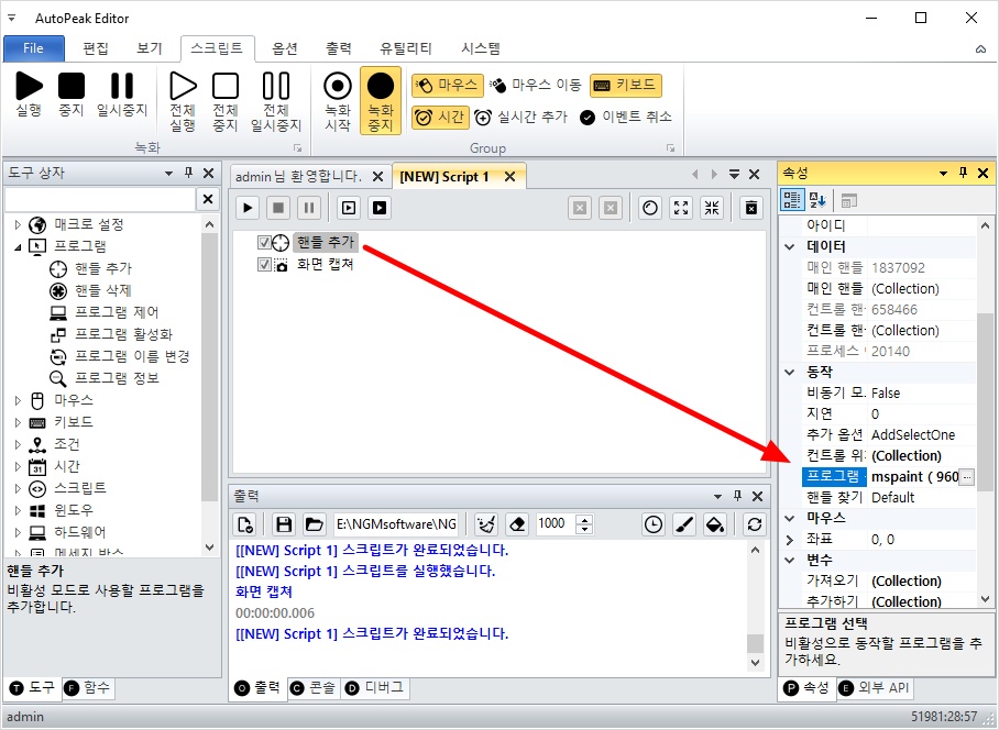 핸들 추가 액션의 속성창에서 프로그램 선택을 클릭하세요. 그리고, 그림판으로 마우스를 이동한 후 F1을 누르세요.