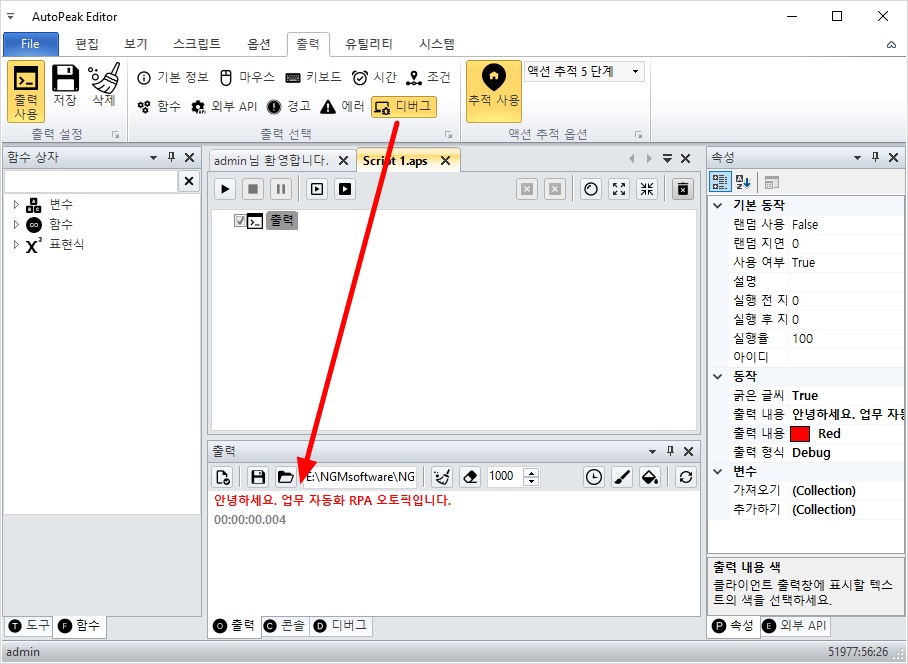 함수 카테고리를 확장하면 아래쪽에 출력 액션이 있습니다.