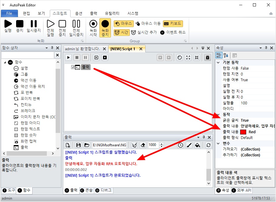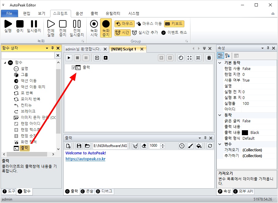 이 액션을 더블 클릭해서 새로운 스크립트에 추가해줍니다.