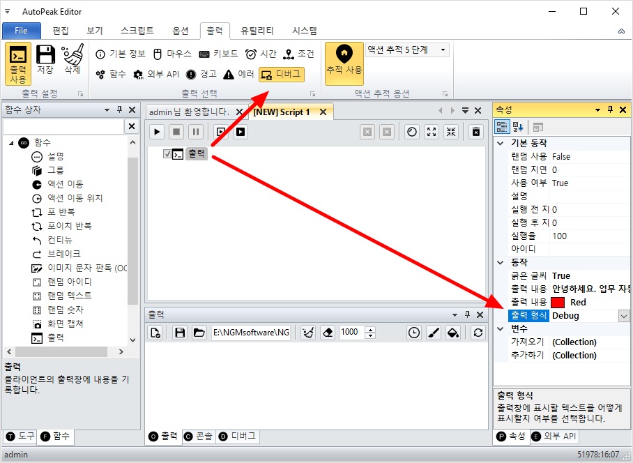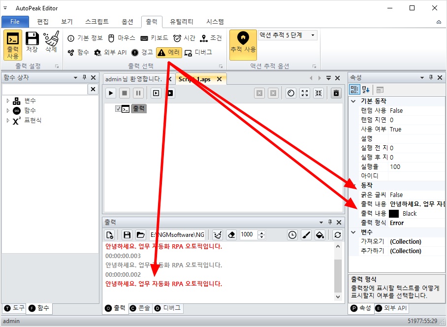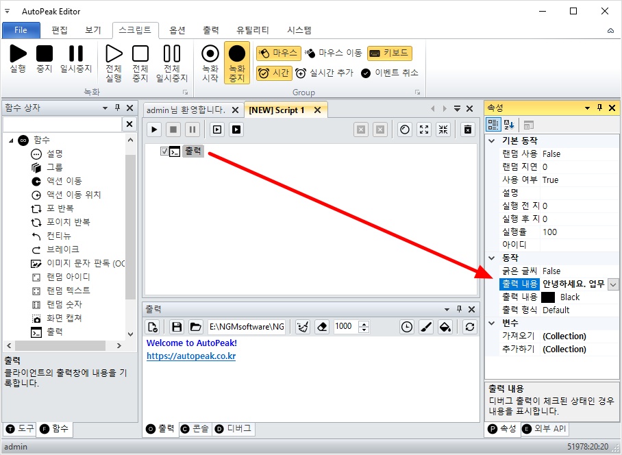 여기에서는 각각의 옵션들에 대해서 자세하게 알아보겠습니다. 아래와 같이 출력 내용에 하단 출력창에 표시할 텍스트를 입력하세요.