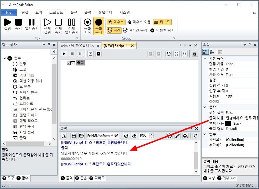매크로를 실행하면 아래와 같이 하단 출력창에 표시됩니다.