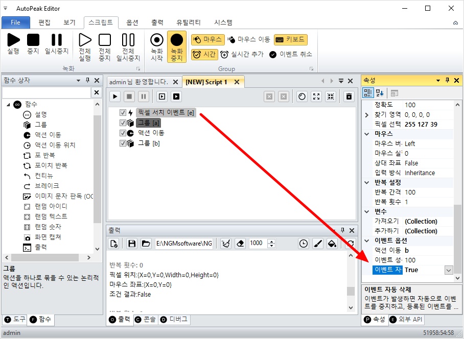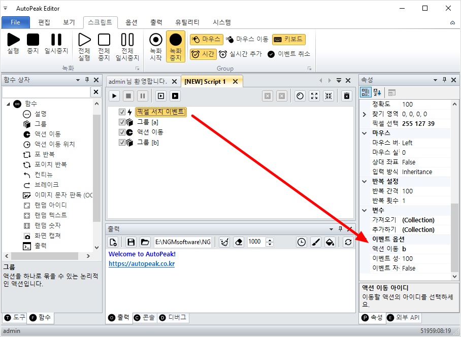 그룹 액션을 추가하고 아이디는 b로 설정한 후 픽셀 서치 이벤트에서 이벤트가 발생했을 때 이동할 아이디로 b를 설정해줍니다.