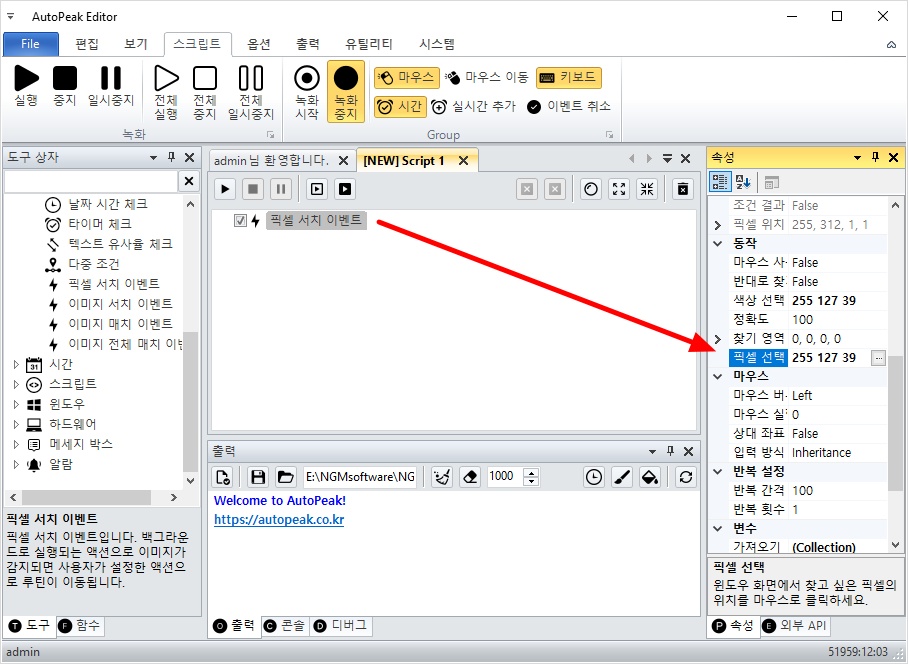 오른쪽 속성창에서 픽셀 선택을 클릭하고, 찾을 픽셀에 마우스를 이동합니다.