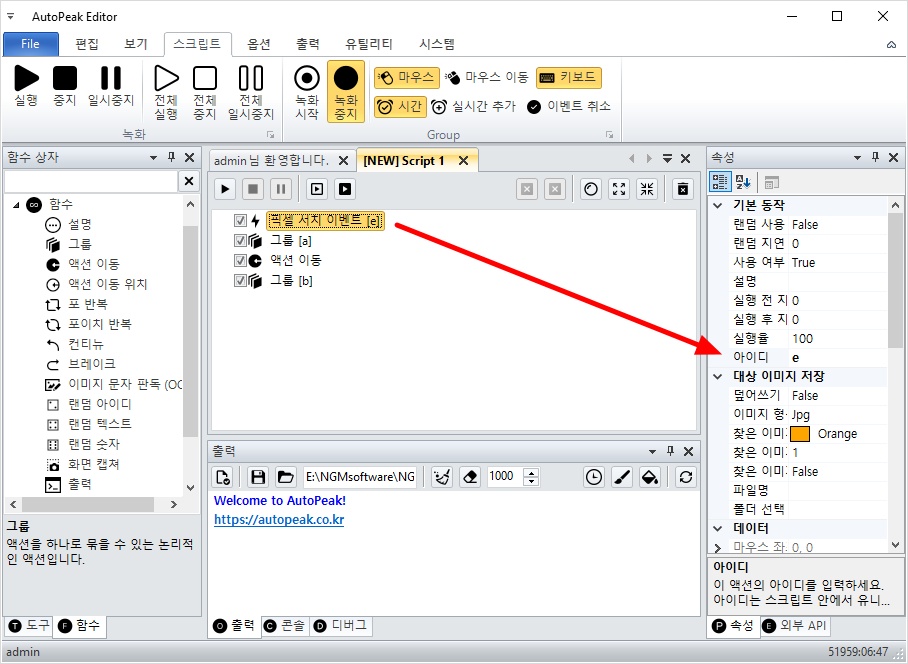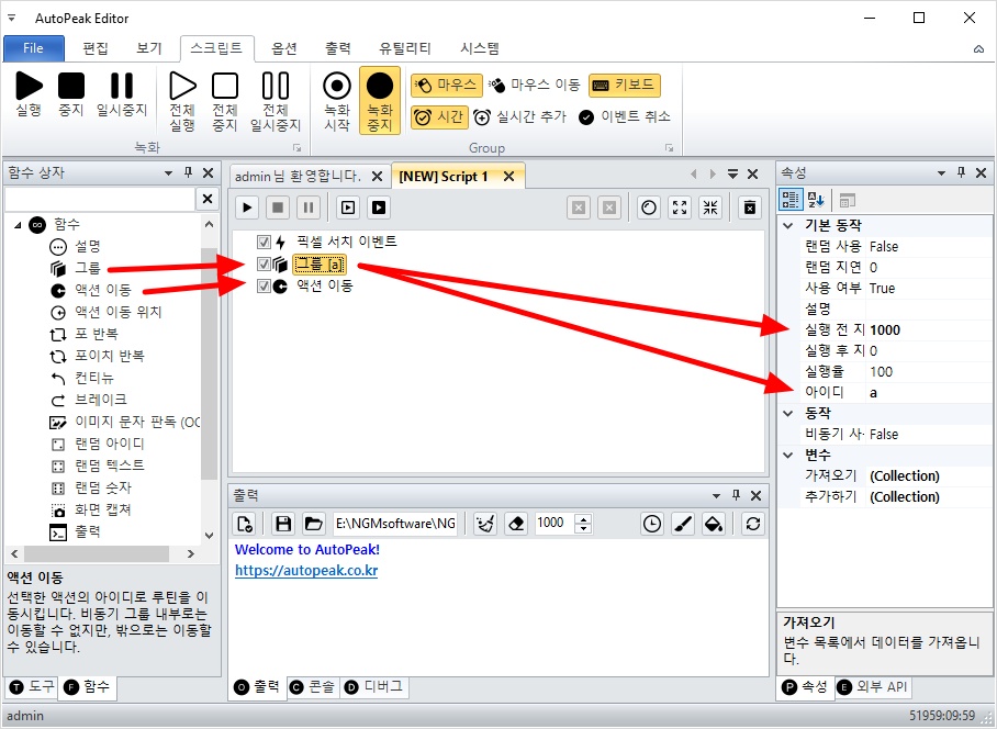 그룹과 액션 이동은 에디터 좌측 하단의 함수 상자에 들어있습니다.