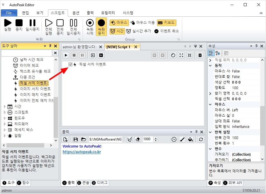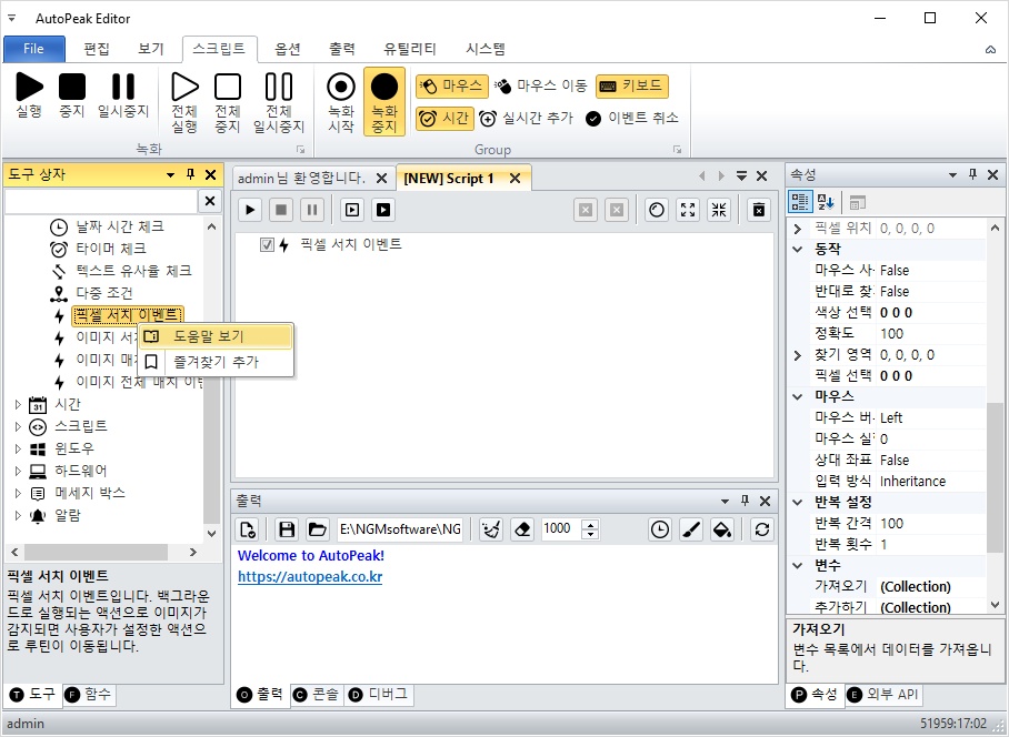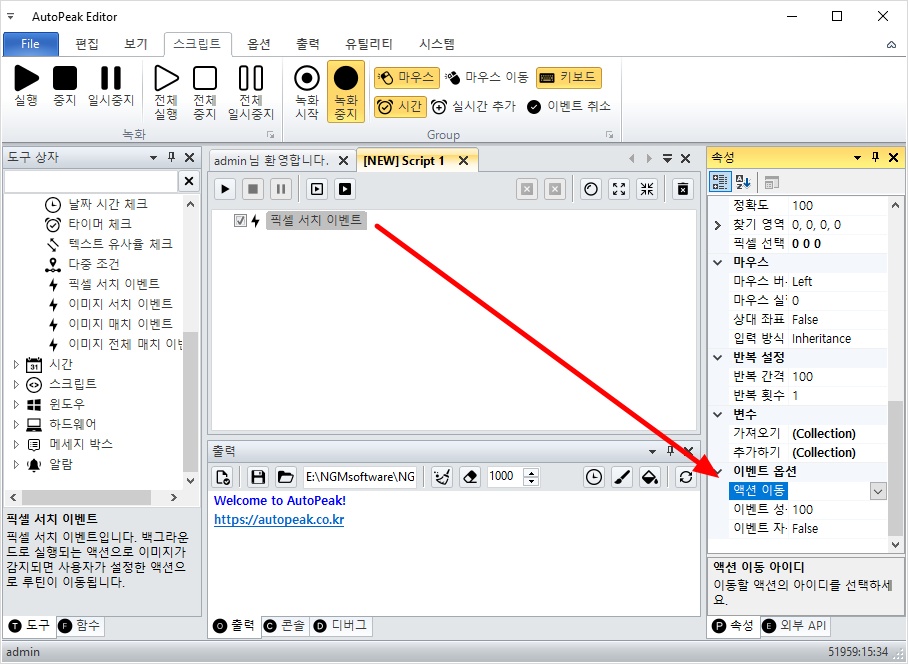 픽셀 서치 이벤트와 이미지 서치 이벤트 관련 액션들은 동일한 이름의 액션들과 기능이 100프로 동일합니다.