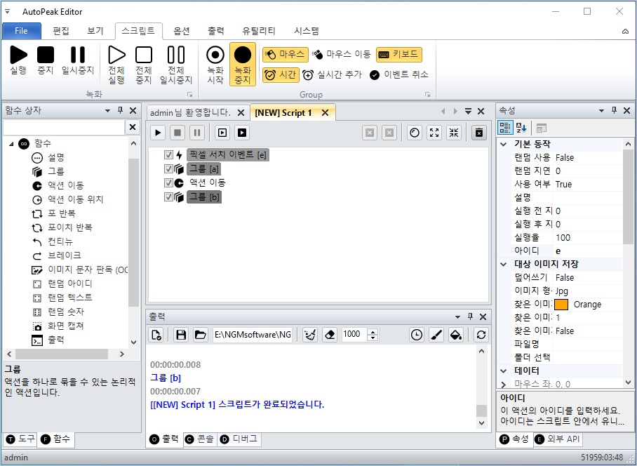 그림판을 최소화 시켜놓고 실행하면 그룹과 액션 이동이 반복하면서 이벤트도 계속해서 픽셀을 찾는걸 확인할 수 있습니다.