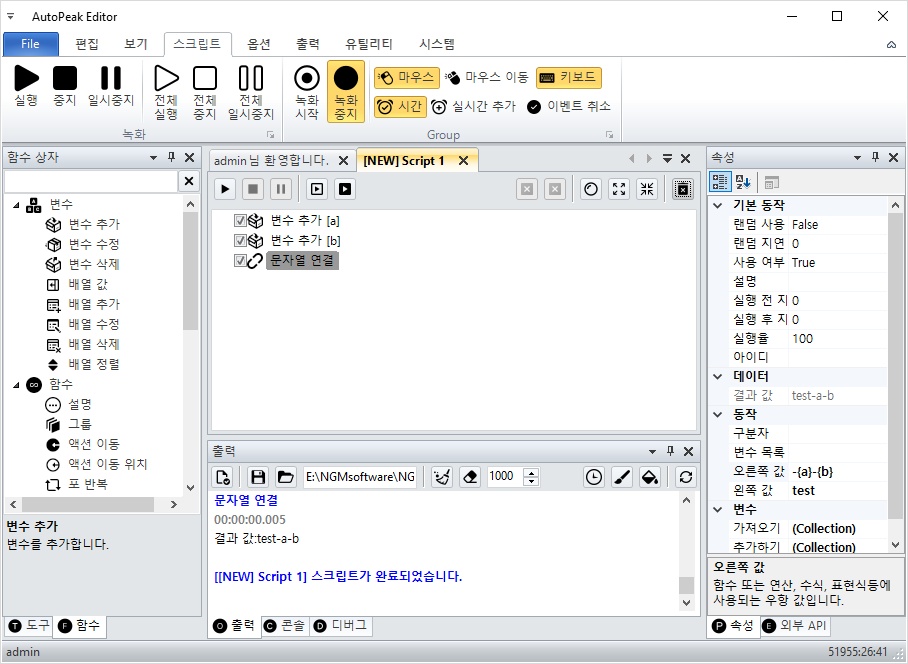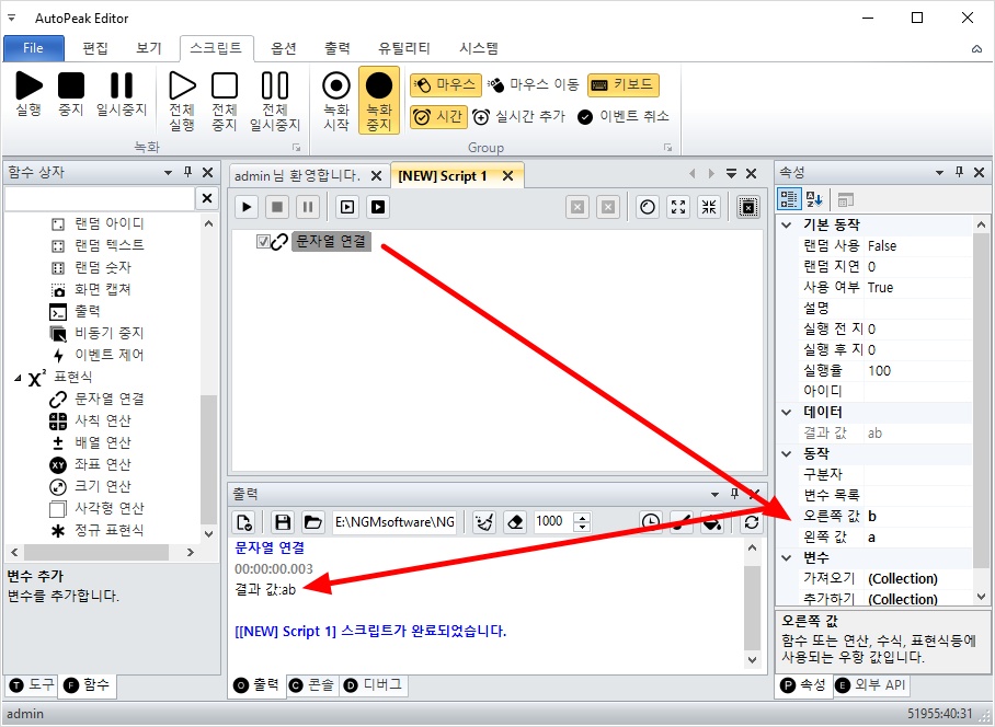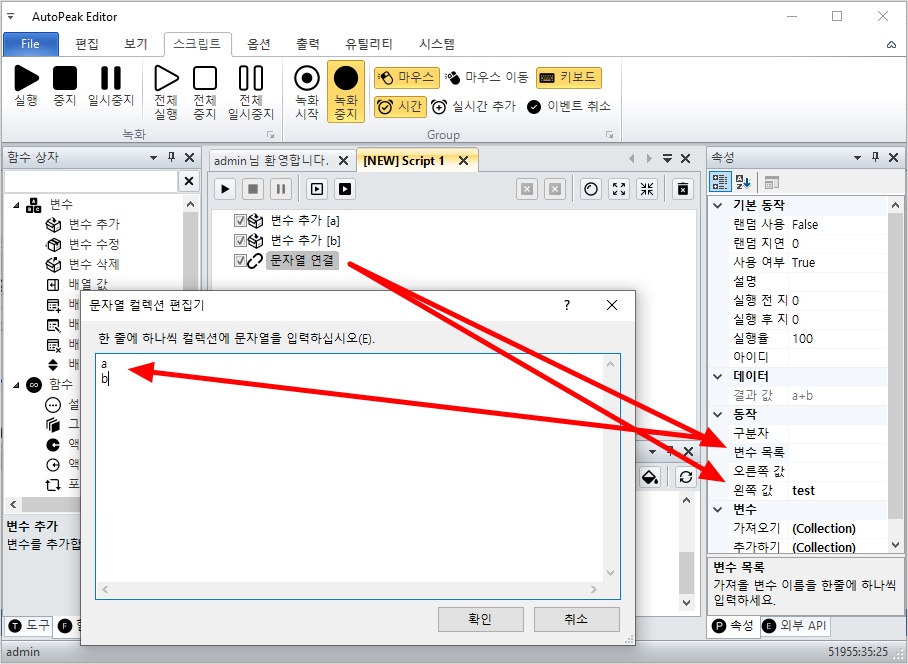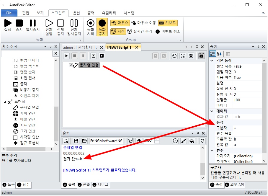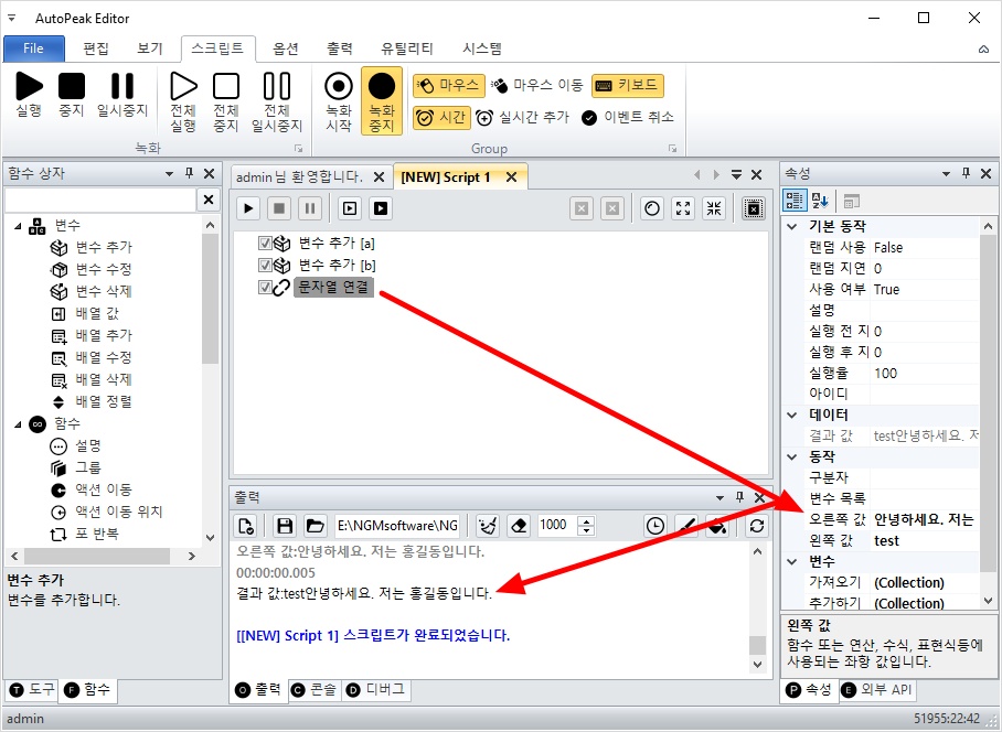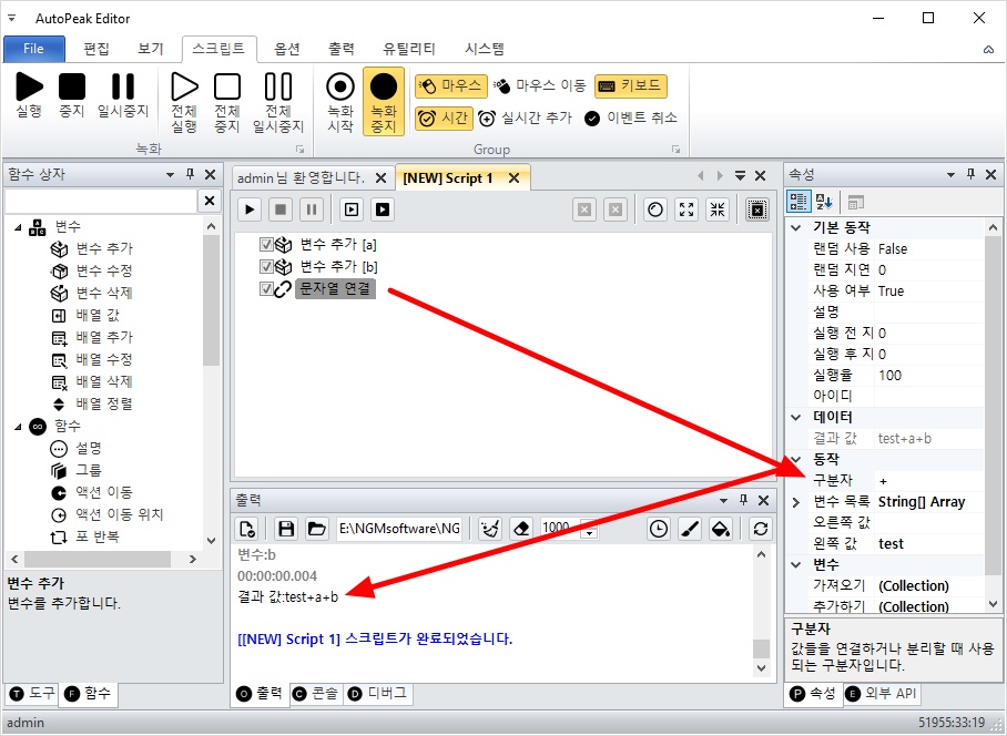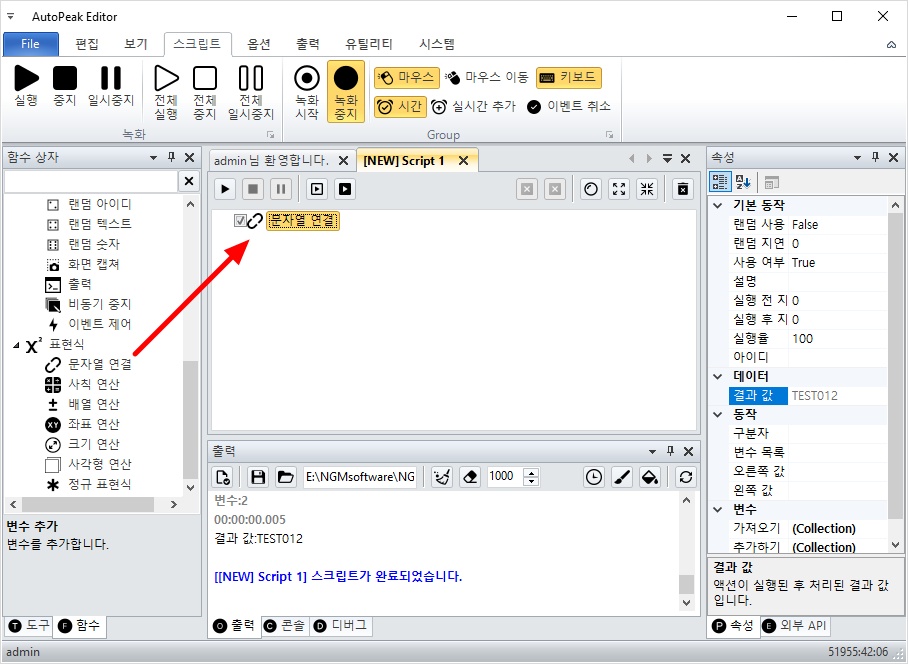 문자열 연결 액션을 더블 클릭해서 스크립트에 추가해줍니다.