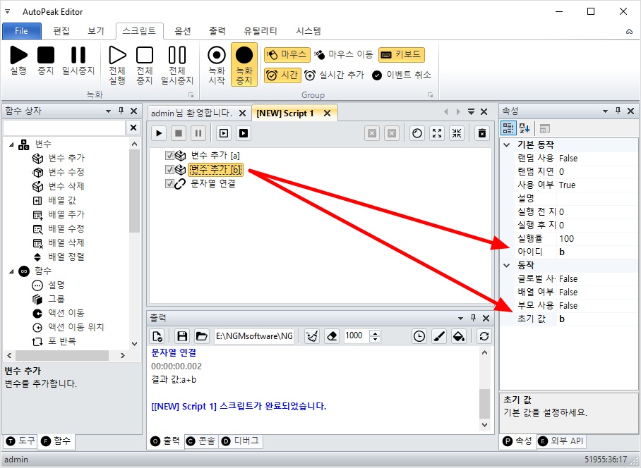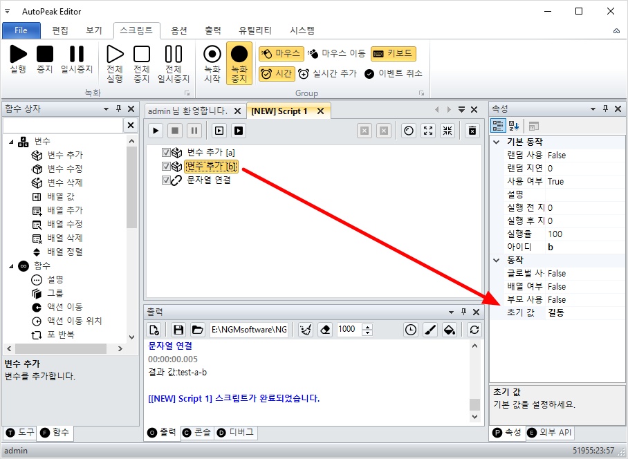 이번에는 변수로 처리하는 방법을 알아볼건데요. 콘트콜키를 누른 상태로 변수 추가 액션을 더블 클릭해서 스크립트에 추가하세요.