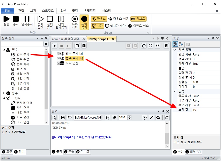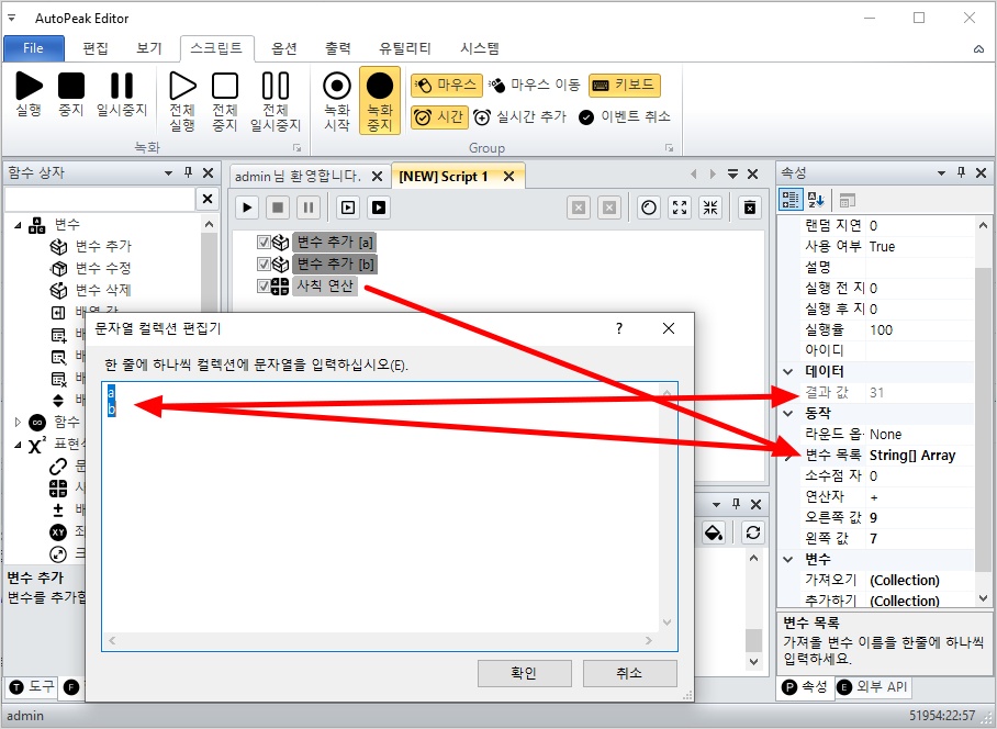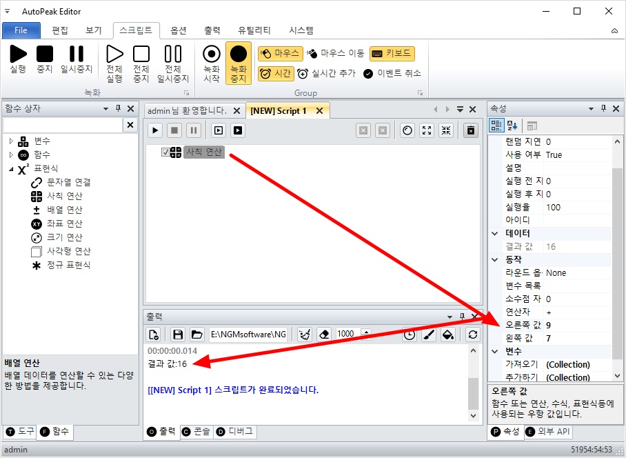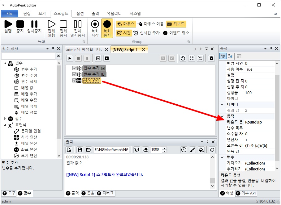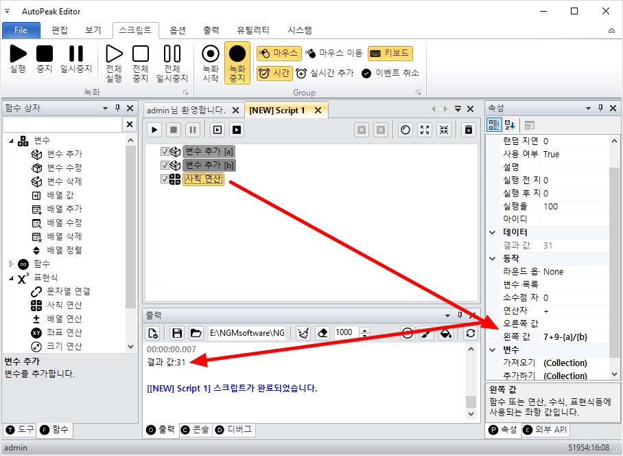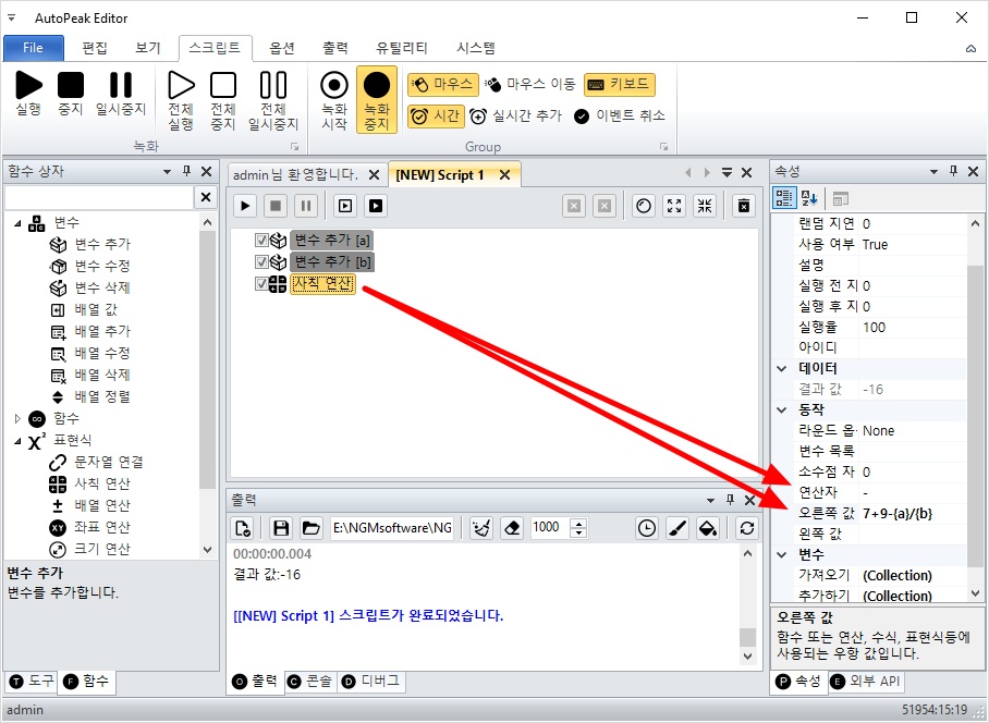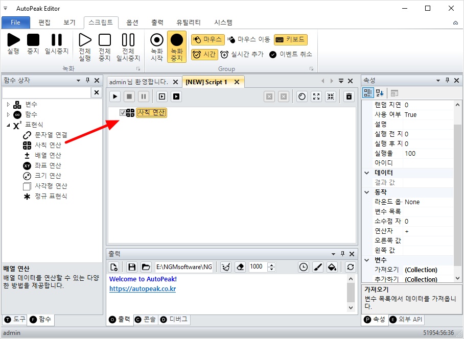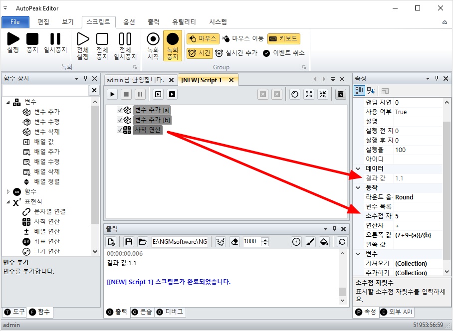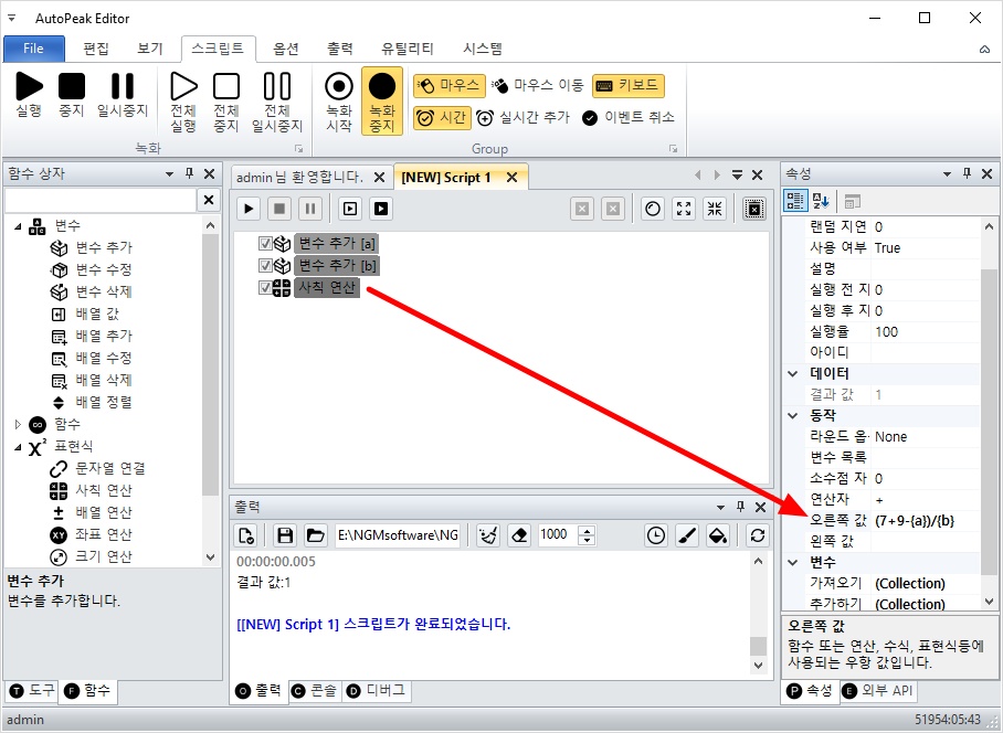 표현식안에 사칙 연산 액션을 더블 클릭해서 스크립트에 추가해주세요.