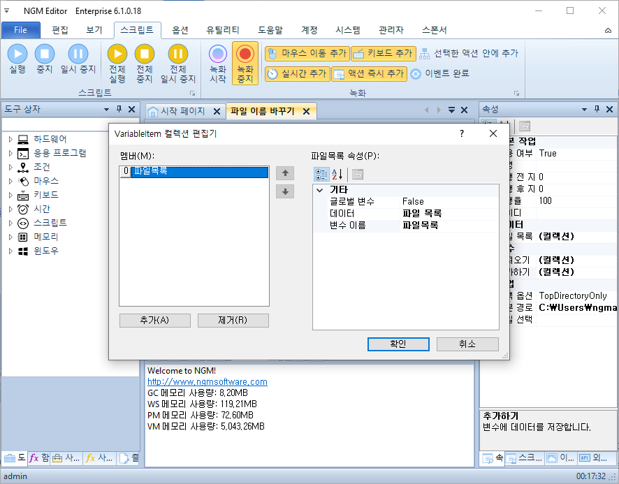 이 액션이 실행되면 사용자가 선택한 폴더(before)의 루트에 있는 모든 이미지를 배열로 가져옵니다. 하지만, 액션이 가지고 있는 정보는 해당 액션이 완료되고 다음 액션으로 넘어가면 메모리에서 삭제됩니다. 그렇기에 다른 액션에서 이 값(파일 목록)을 사용하려면 변수에 저장해야 합니다. [ 변수 ]에 저장하기 위해 파일 목록 액션의 속성에서 추가하기를 클릭하세요. VariableItem 컬렉션 편집기 창에서 좌측 하단에 "추가"를 클릭하세요. 그리고 변수 이름과 데이터를 목록에서 선택해줍니다.