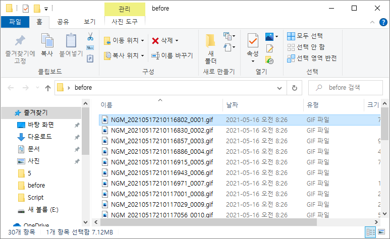 안녕하세요. 엔지엠소프트웨어입니다. 유틸리티에 파일명을 쉽게 바꿀 수 있는 유틸리티가 포함되어 있는데요. 이 기능보다 더 파워풀하게 작업하려면 매크로를 이용해야 합니다. 변수로 원하는데로 처리가 가능하기 때문이죠. 우선, 바탕화면의 폴더(before)에 예제로 사용할 이미지 파일들을 모아둡니다. 저는 아래와 같이 넣어두었습니다. 그리고, 파일을 복사하거나 이동할 after 폴더도 하나 생성하세요.