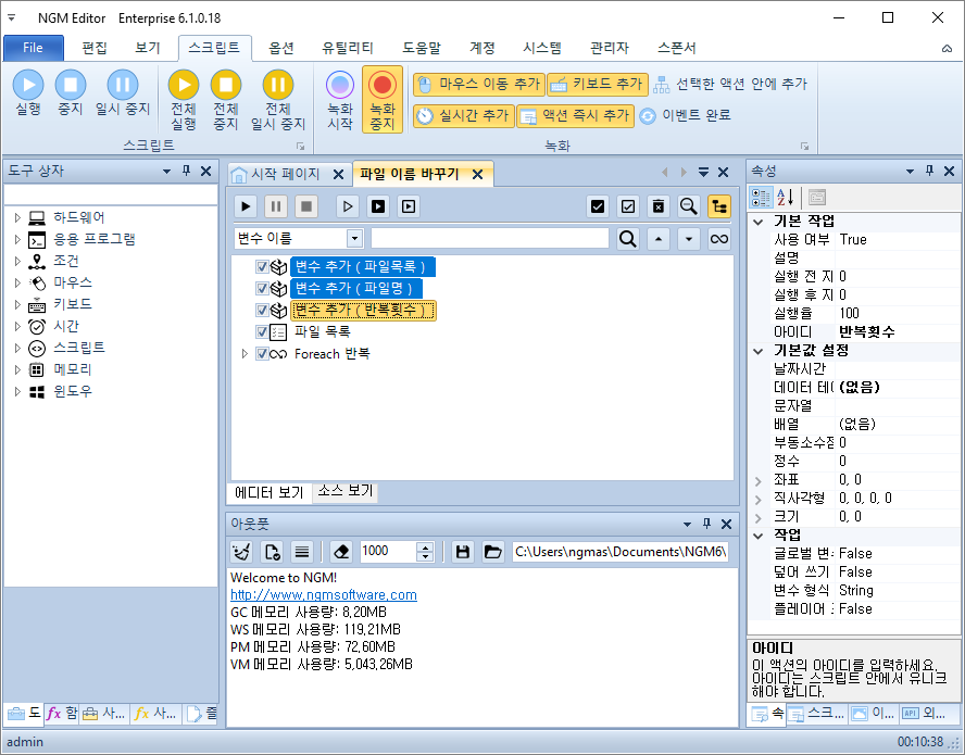 파일 목록 배열의 길이(항목 수)만큼 파일을 처리하기 위해 읽어온 값을 "파일명" 변수에 저장해줘야 합니다. 그래야, 아래에 있는 목록의 값을 처리할 수 있기 때문입니다. 추가로 반복된 횟수도 변수에 저장하세요. 이 변수의 값은 아래에 추가된 [ 파일 이동 ]에서 파일명을 만들때 순차적으로 번호를 붙여줄 때 사용합니다.
