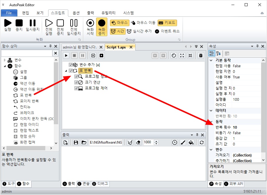 함수 상자의 함수 카테고리에 있는 포 반복을 추가한 후 아래와 같이 3개의 액션을 하위로 추가합니다.