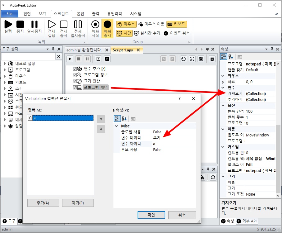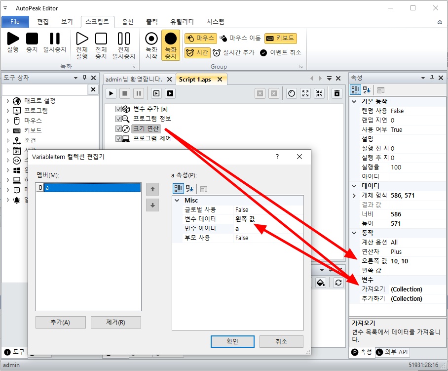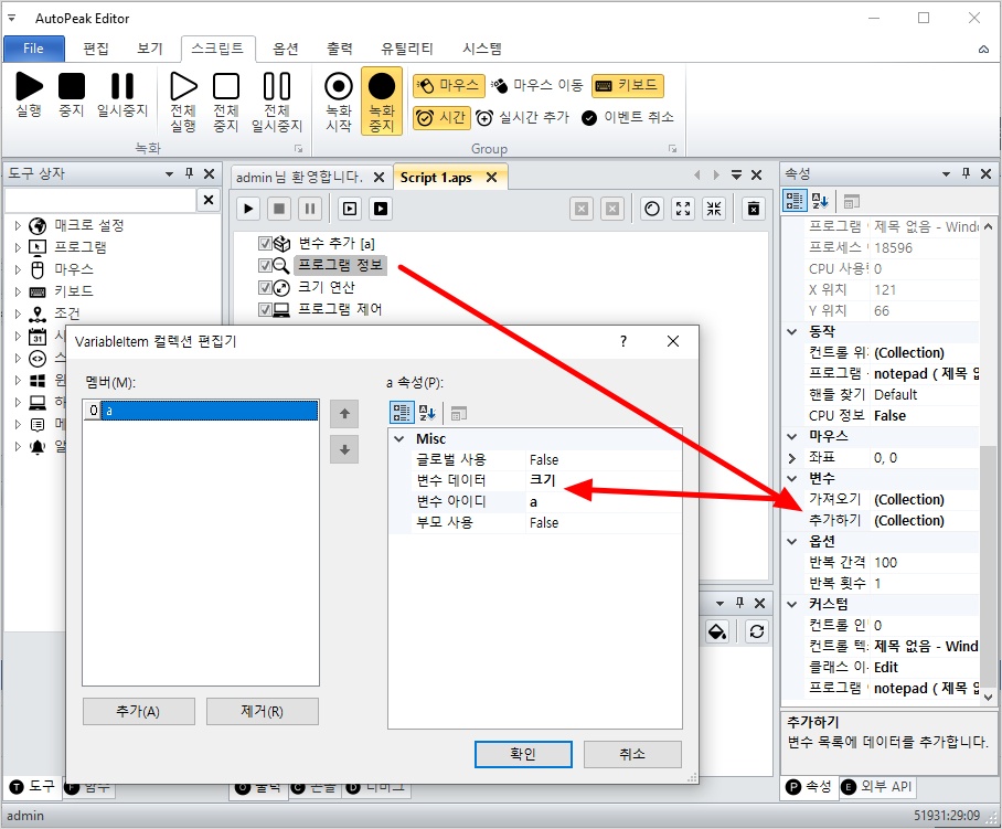 오토픽 에디터를 실행하고, 왼쪽 하단의 도구 상자에서 변수와 프로그램 정보를 추가하세요.