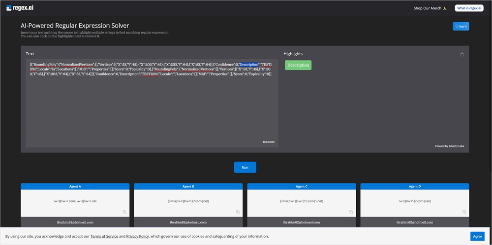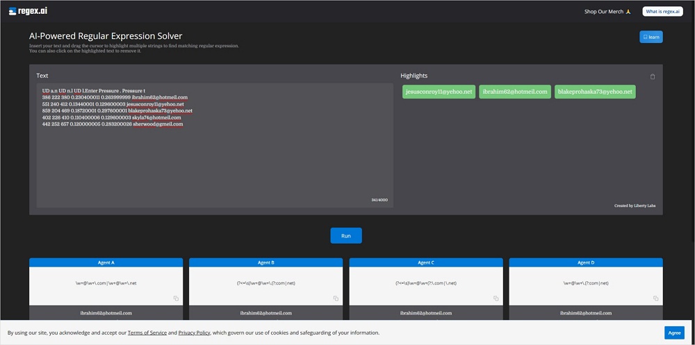 하단의 Run 버튼을 클릭하세요. 4개의 에이전트가 분석해서 정규식을 자동으로 만들어주는데요.