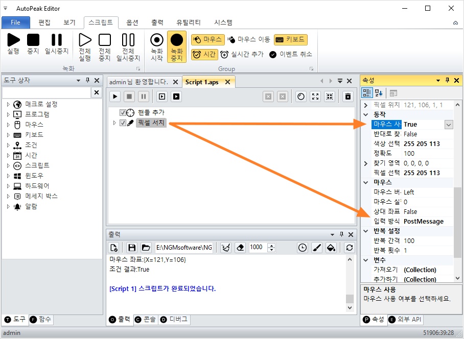 일단, 마우스 사용을 True로 설정하면 해당 프로그램에서 픽셀을 찾으면 마우스 동작이 발생합니다.