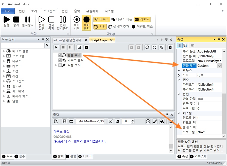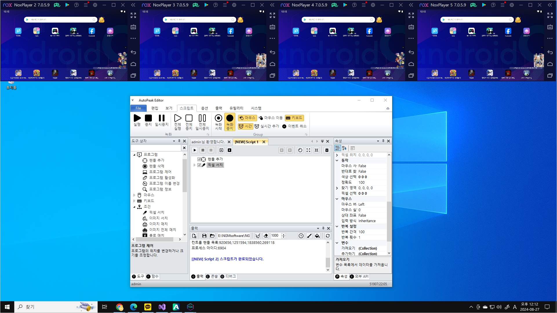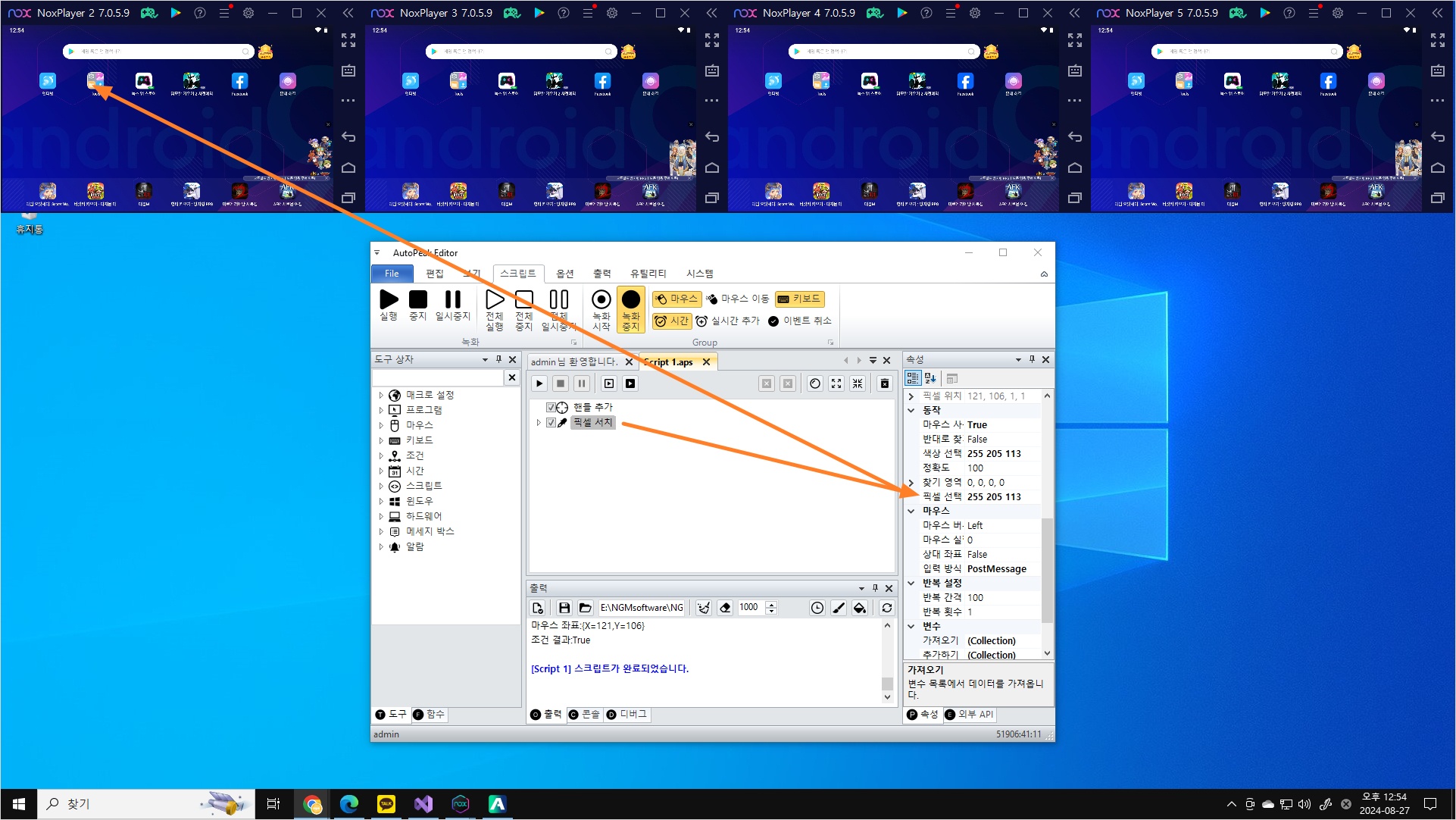 정리하면 기준이 되는 첫번째 녹스에서 픽셀 서치 또는 이미지 서치가 되면, 핸들이 등록된 프로그램 수만큼 마우스와 키보드가 동작합니다.
