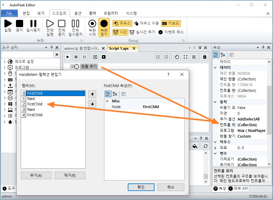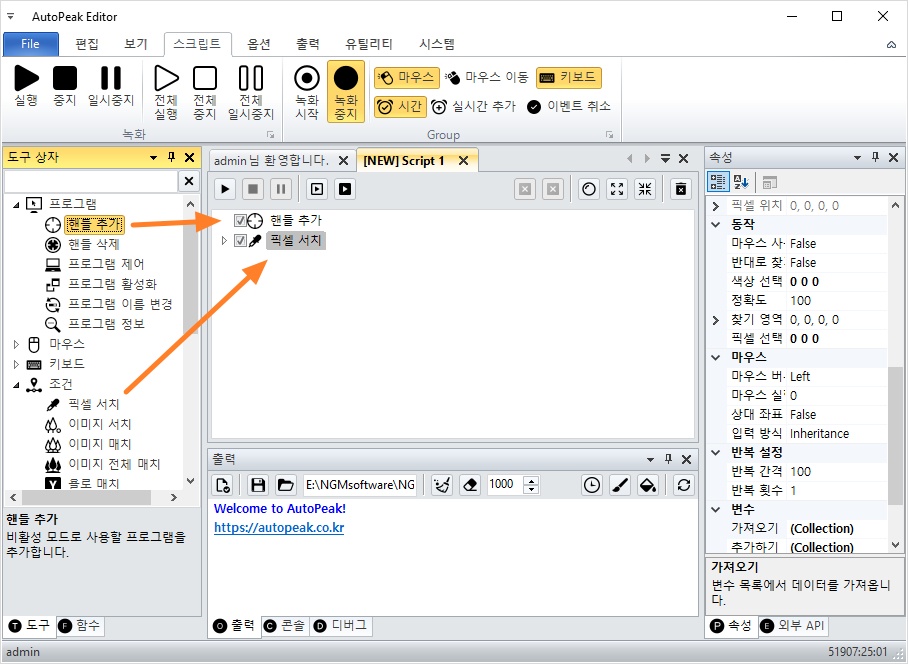 핸들 추가 액션을 더블 클릭해서 스크립트에 추가하세요.