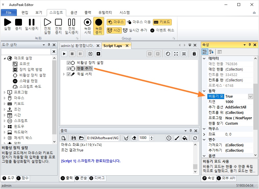 첫번째 녹스에서 한번만 픽셀 서치 또는 이미지 서치가 발생하고, 참이라면 마우스, 키보드만 복사해서 입력해주는 방식입니다.