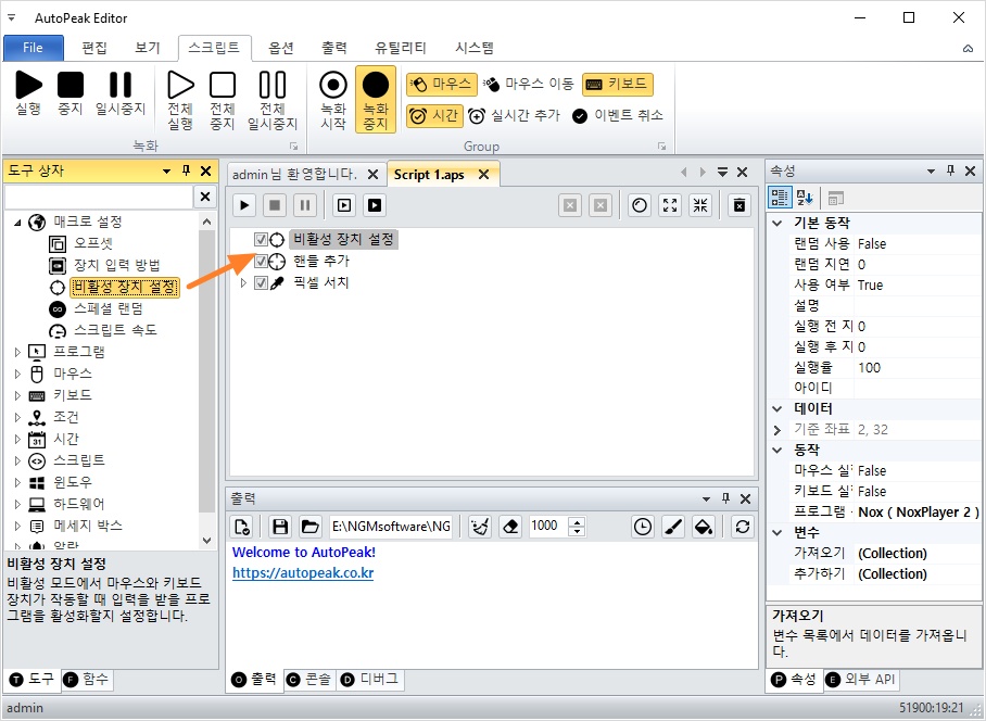 일단, 기준이 되는 좌표를 설정해줘야 합니다. 도구 상자의 매크로 설정에서 비활성 장치 설정 액션을 추가하세요.