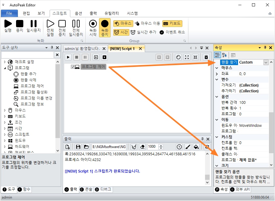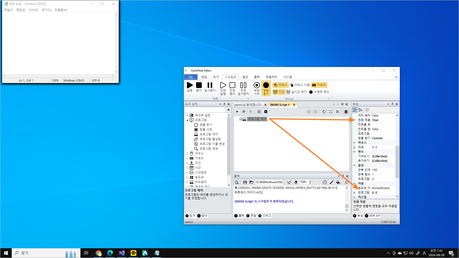메모장의 이름은 모두 제목 없음 - Windows 메모장입니다. 핸들 찾기를 Custom으로 변경하고, 제목이 매칭되는 모든 프로그램을 가져오려면 별표를 사용합니다.