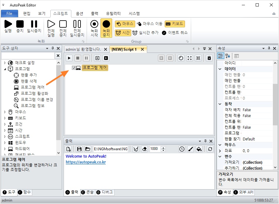 오토픽 에디터를 실행하고, 왼쪽 하단의 도구 상자에서 프로그램 카테고리를 확장하세요.