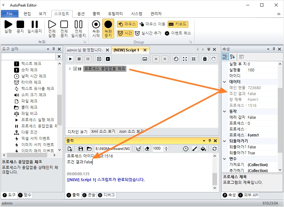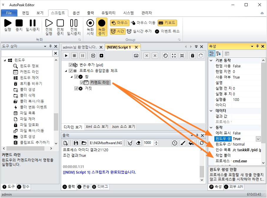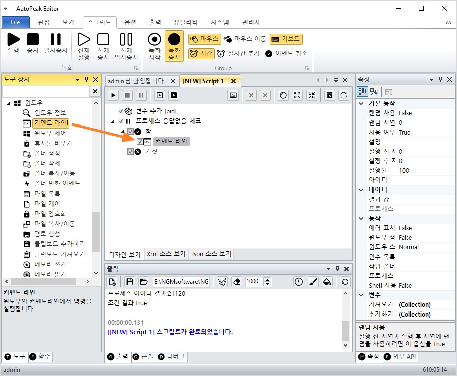 도구 상자의 윈도우 카테고리에 있는 커멘드 라인 액션을 프로세스 응답없음 체크 액션의 참 아래로 추가하세요.